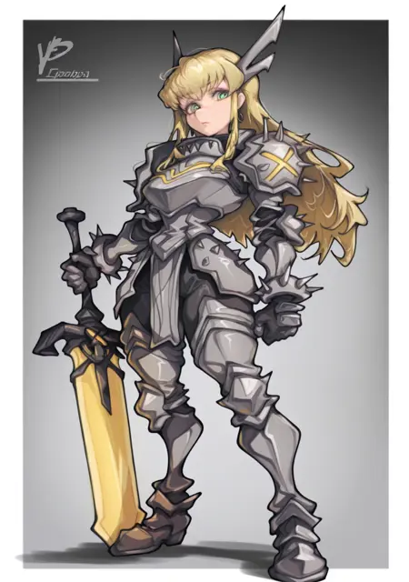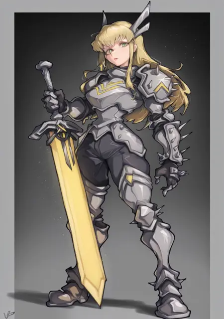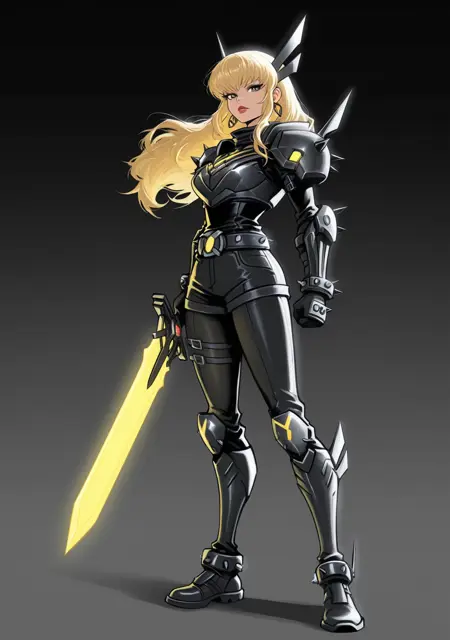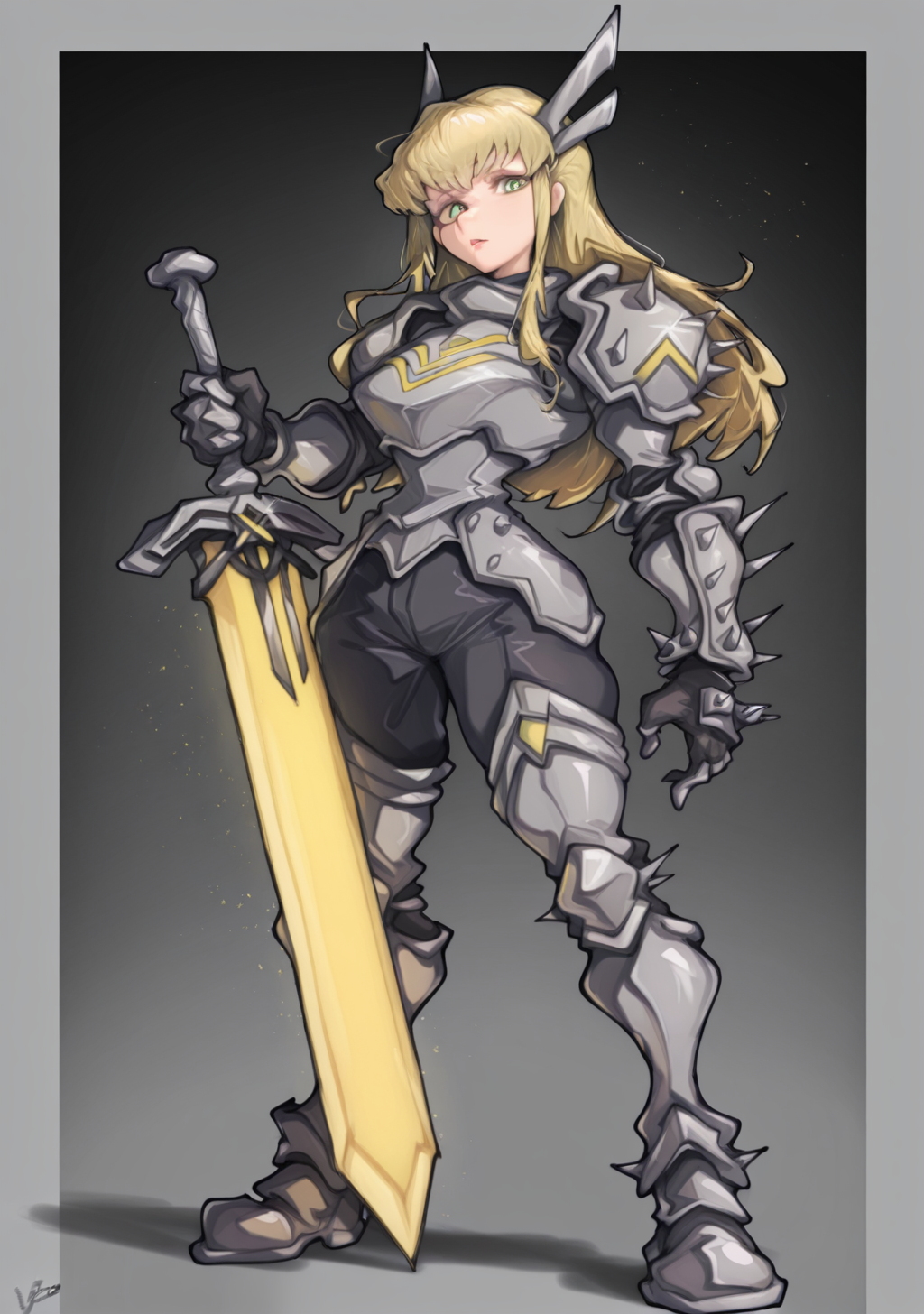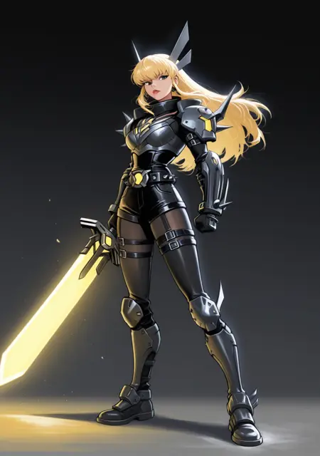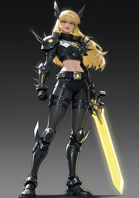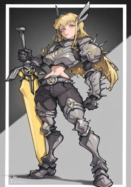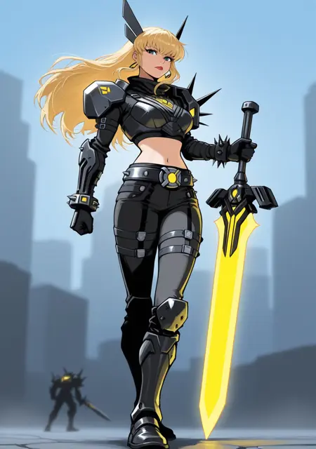Prompts: magik, xmen, blonde hair, holding weapon, armor, holding sword, midriff, base armour