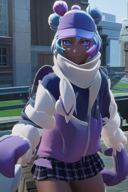 치마, 모자, 재킷, 신발, 양말, 미니스커트, 스카프, 체크무늬, 체크무늬 치마, 스니커즈, 장갑, 보라색 머리 장식, 느슨한 양말, 레그 워머
