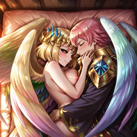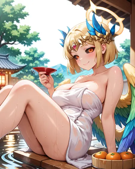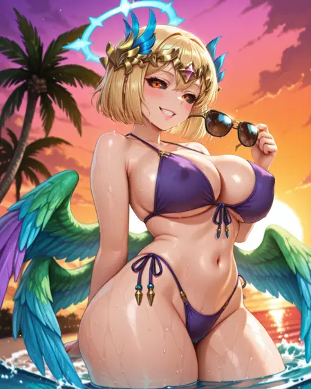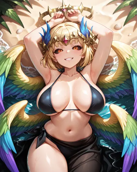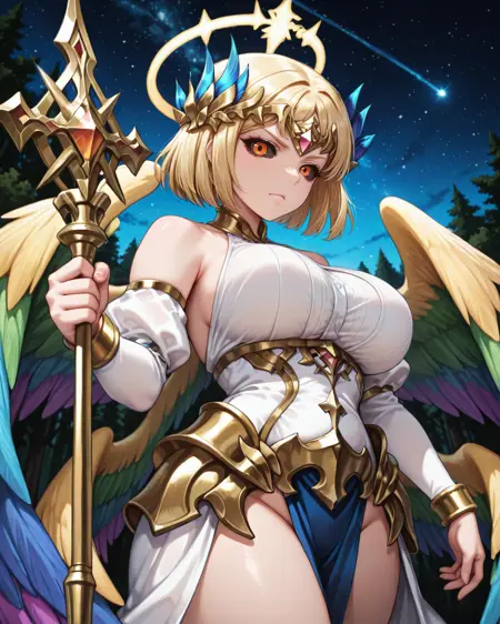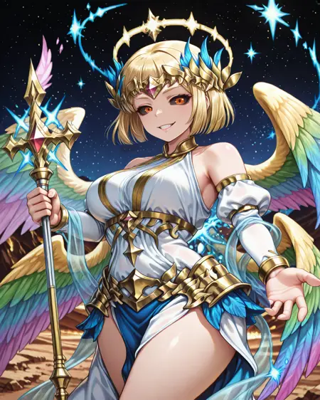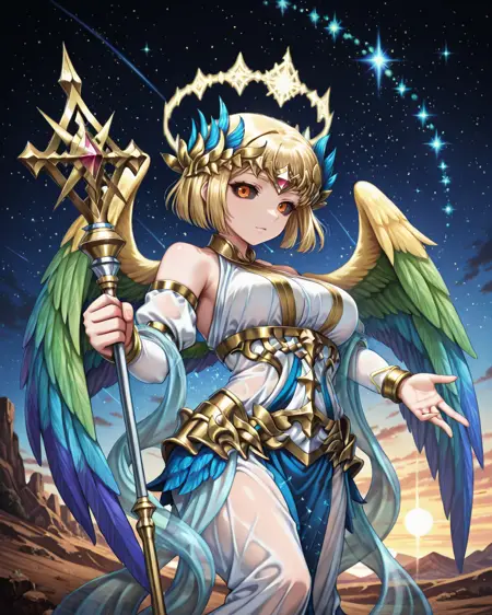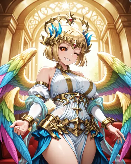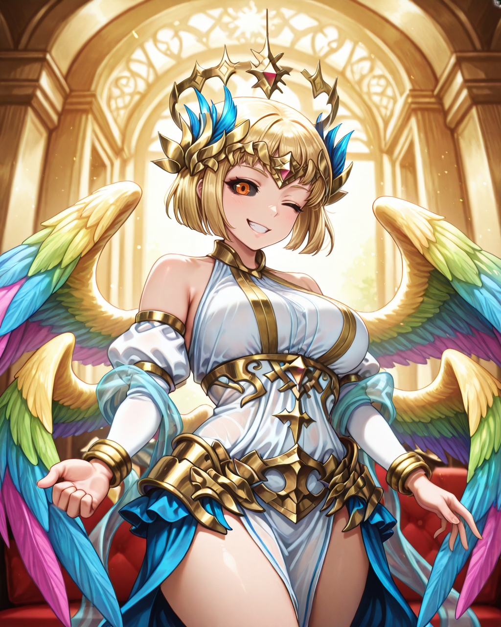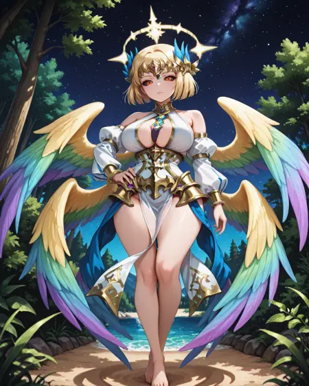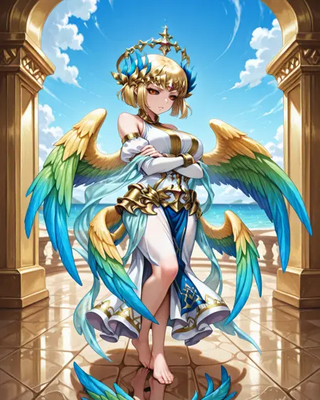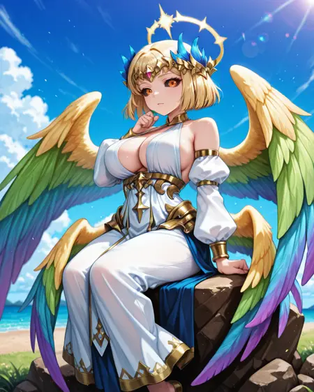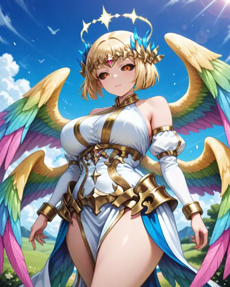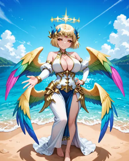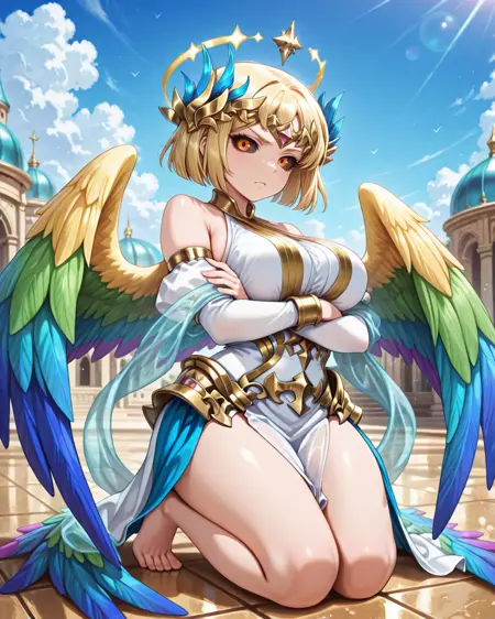 유용한 태그: 1girl, 검은 공막, 주황색 눈, 금발, 단발, 환상, (여러 개의 날개, 다채로운 날개), 머리 장식, 헤드피스, 어깨 노출, 흰 드레스, 분리된 소매, 노란 팔찌, 금장식, 노란 풀드, 파란 골반 커튼, 맨발,