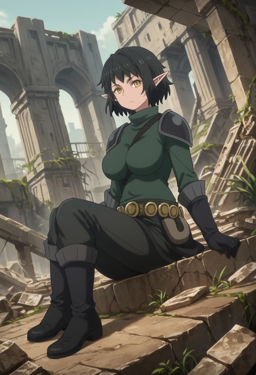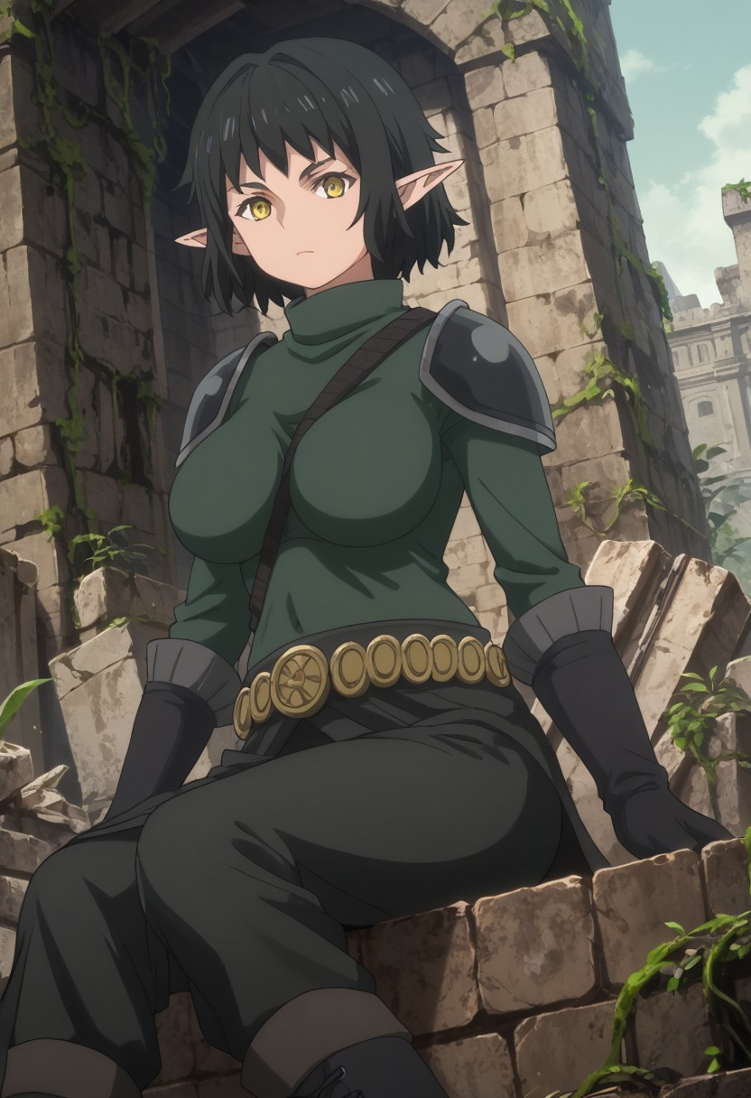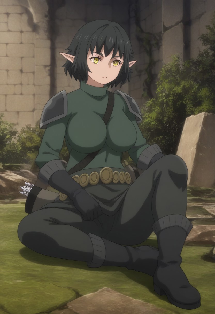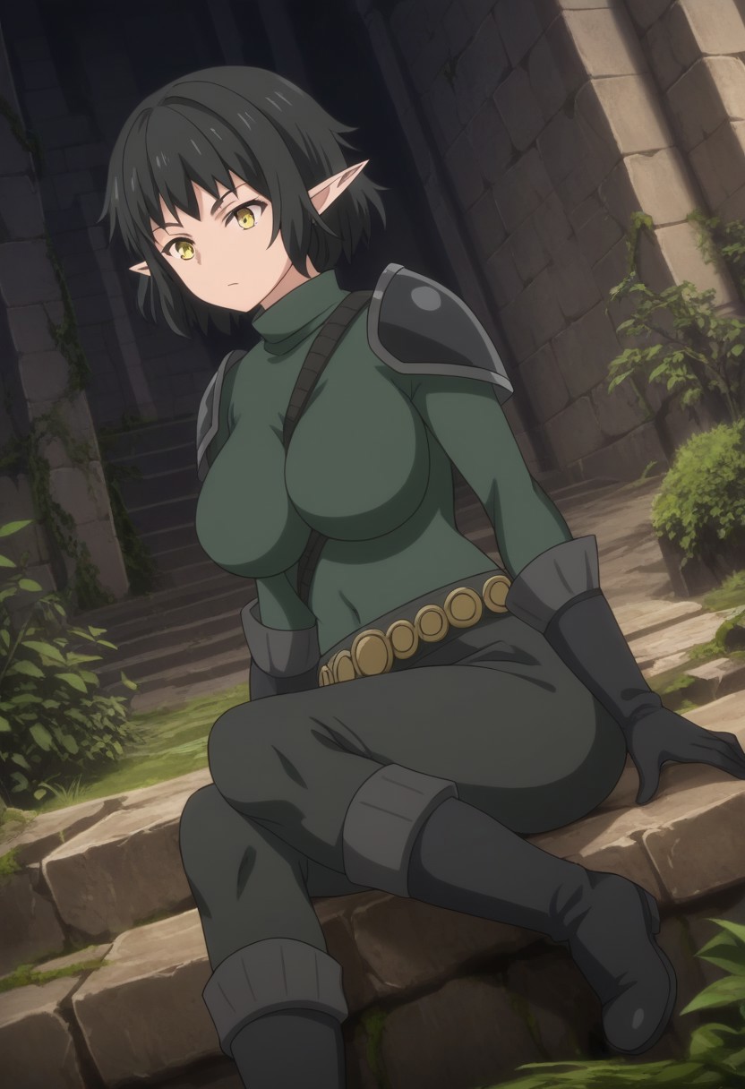 - black hair, short hair, elf, yellow eyes, large breasts,
