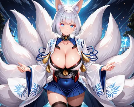 动物耳朵、尾巴、狐狸耳朵、狐狸尾巴、蓝眼睛、白发、多条尾巴、和服、宽袖、短发、百褶裙、蓝色裙子、白色和服、狐仙、狐狸女孩、樱花纹、长袖、黑色过膝袜、迷你裙、袴短裙、绝对领域、白色尾巴