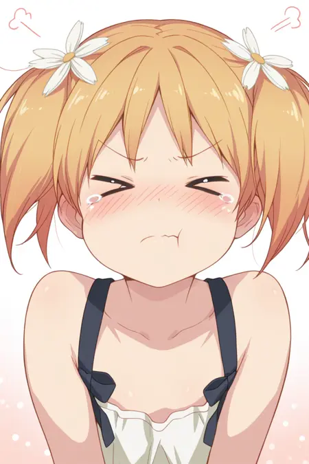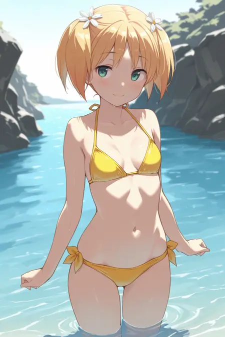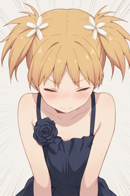 yuu, 1girl, solo, short twintails, hair ornament, green eyes, dark blue dress,