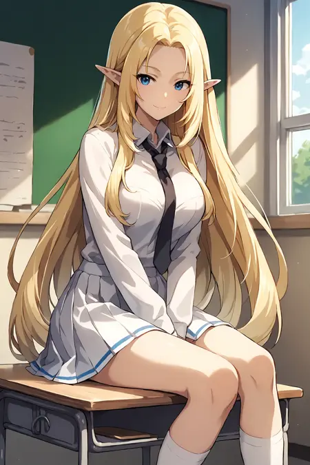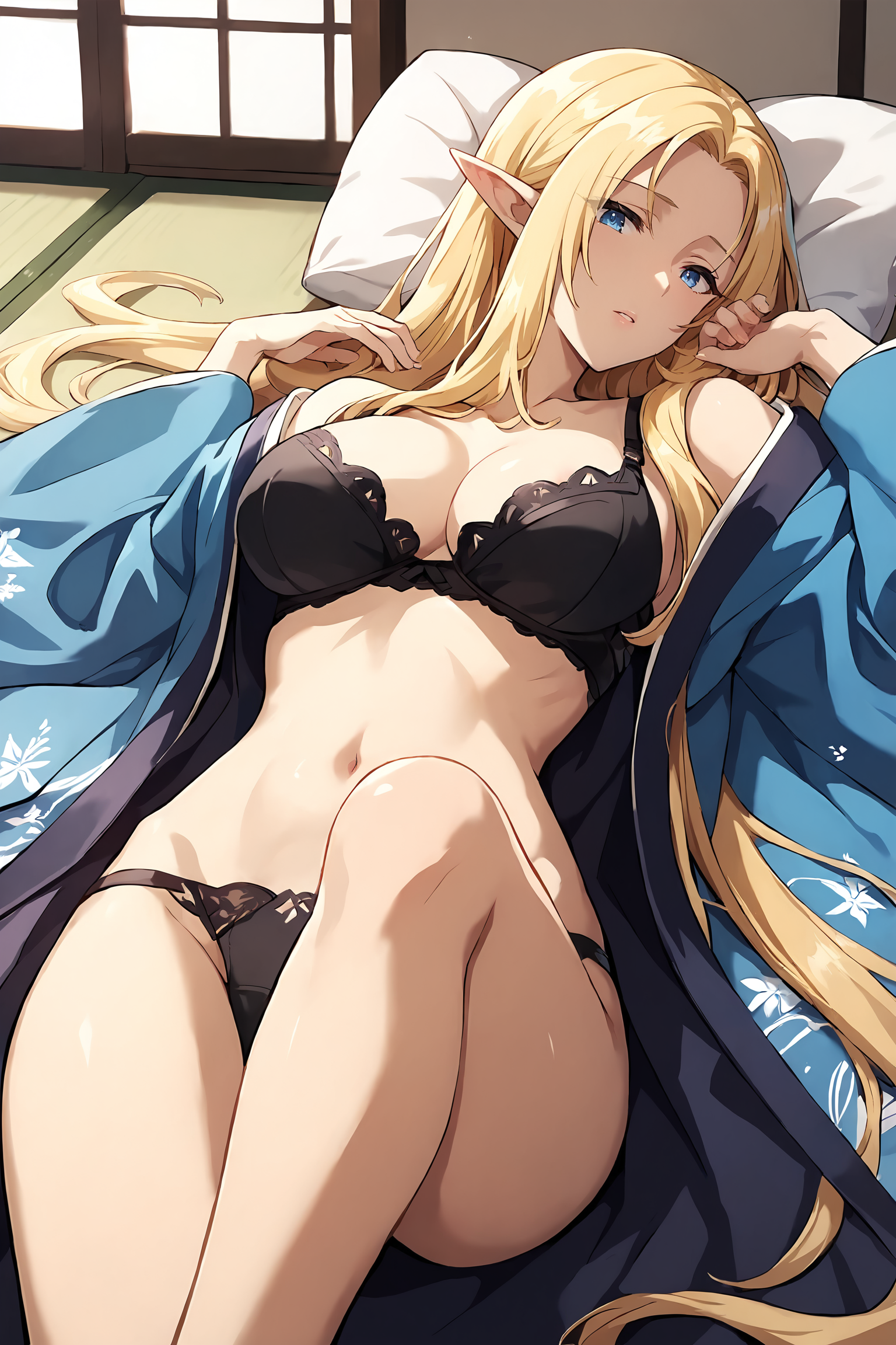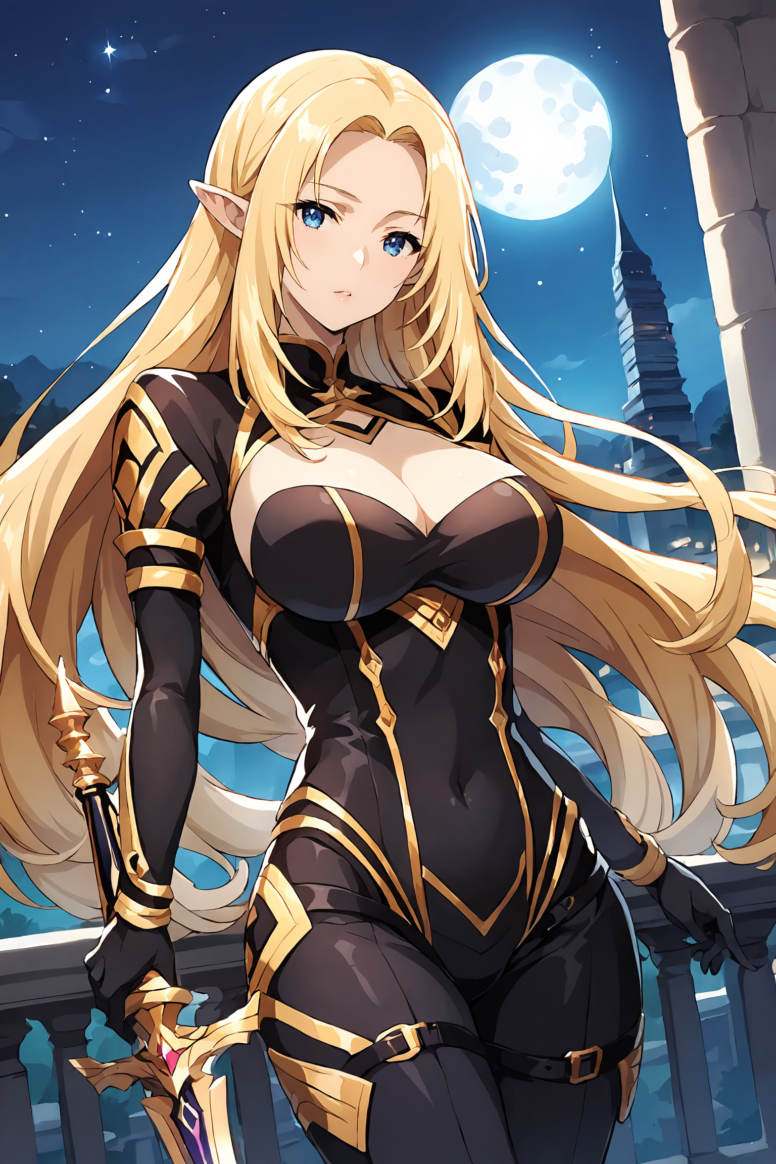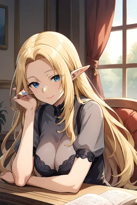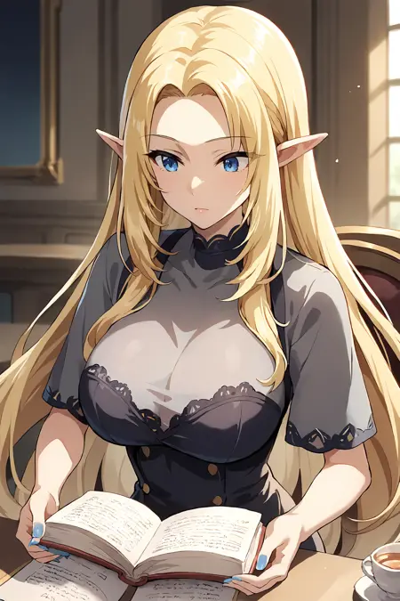 Alpha,elf,blonde hair,very long hair,parted bangs,blue eyes,pointy ears,large breasts,