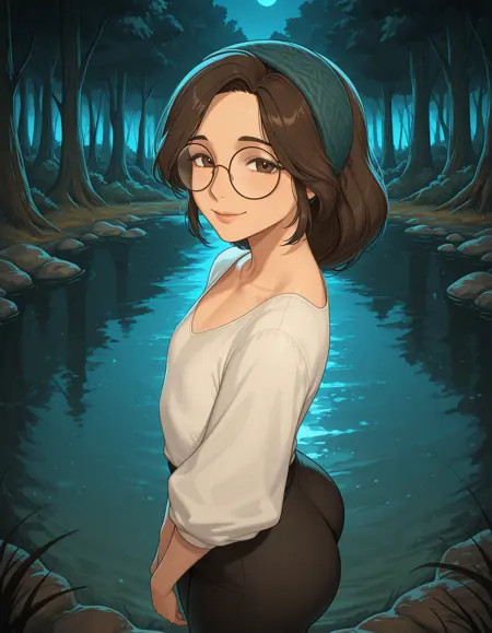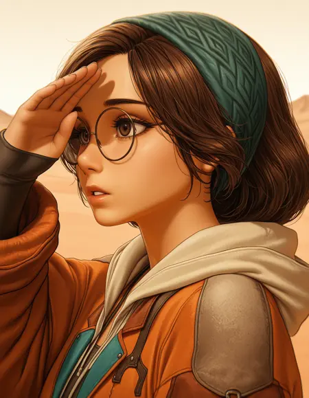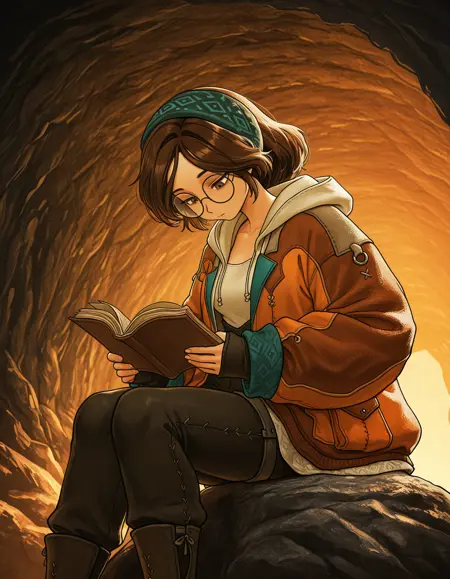 almaMH, brown hair, hairband, brown eyes, round eyewear, Alma_Outfit, orange jacket, sleeves past wrists, black pants
