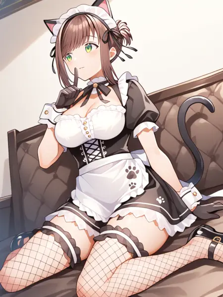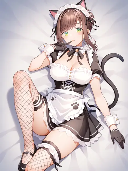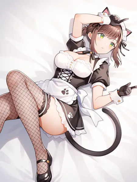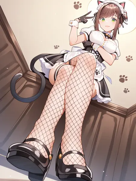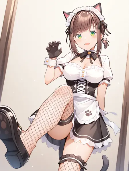 提示示例:meido,女仆,女仆头饰,女仆围裙,蓬松短袖,露胸设计,手套,腕箍,迷你裙,渔网丝袜,猫耳,猫尾,玛丽珍鞋,爪印,绿眼睛,爪印丝袜,短发,