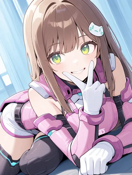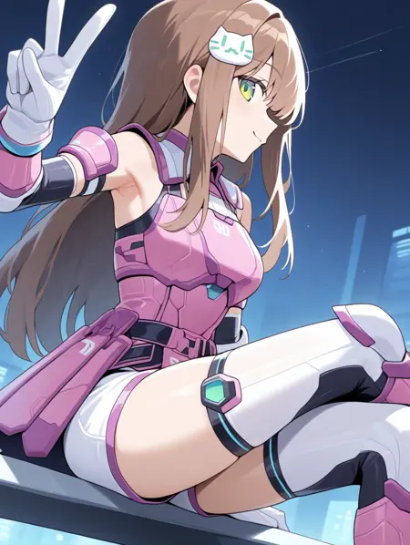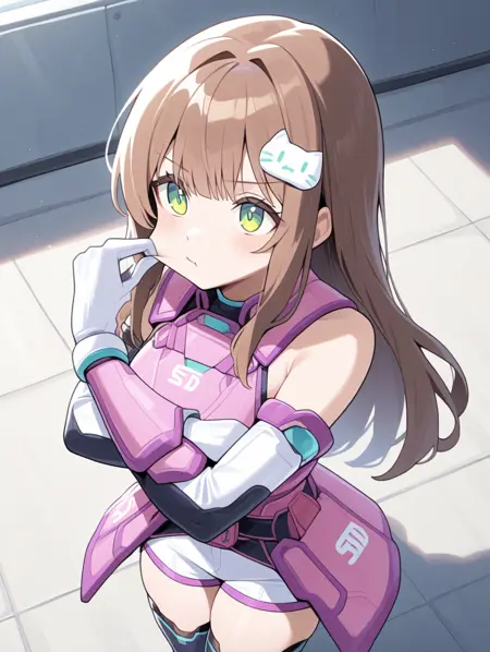 prompt example :SRF,long hair,cat hair ornament,detached sleeves,pink armor,thighhighs,white short shorts,white gloves,green eyes,