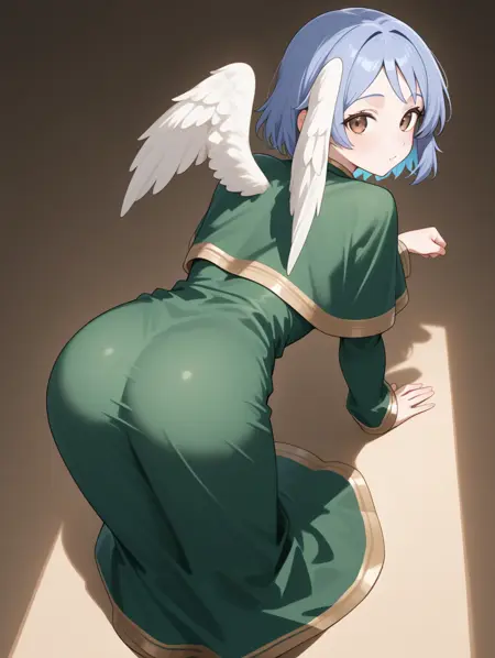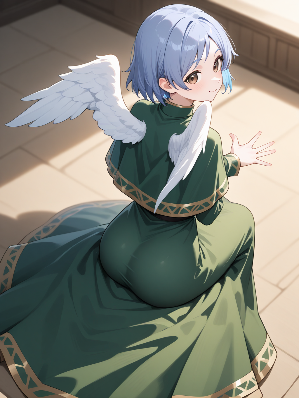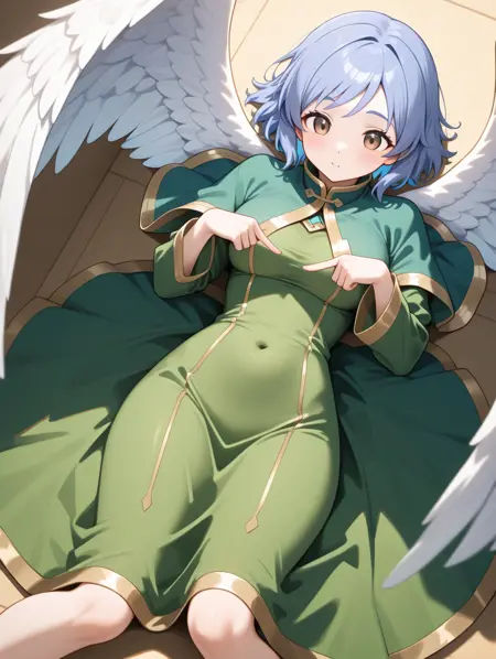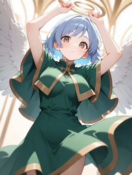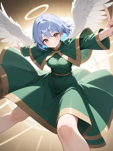 プロンプト例: sutaanisu,blue hair,short hair,brown eyes,green capelet,green long dress,gold trim,angel wings,