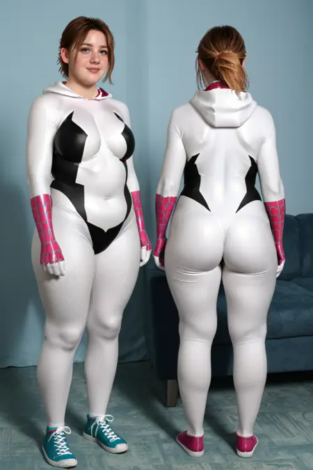 이는 플러스 사이즈 여성이 스파이더 Gwen 복장을 입은 혼합된 이미지입니다