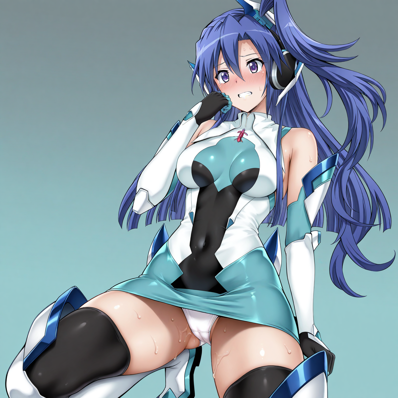 1girl, solo, SymphoBasa, 紫色眼睛, 蓝色头发, 长发, 发丝遮眼, 一侧头发向上, 白色发夹, 红色Symphogear项链, 黑白配蓝边SG-01耳机, 白蓝配色SG-01发夹, 白色SG-0领口, 露肩, 浅蓝黑SG-01内层紧身衣, 浅蓝SG-01腰罩, 白色内裤, 浅蓝SG-0x肘部手套, 白色SG-01护腕, 黑色过膝袜, 白蓝配色SG-01膝靴, 黑色手套带蓝色手指