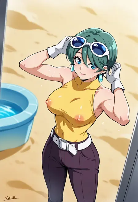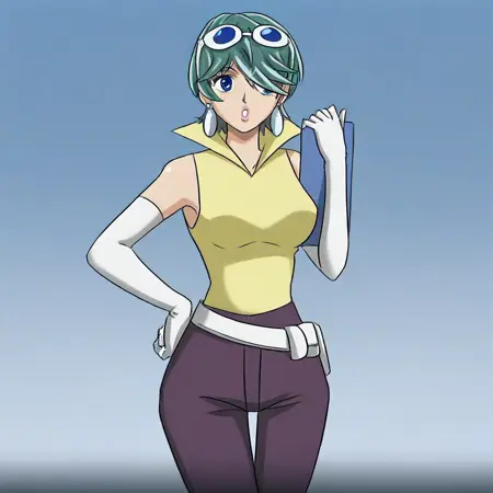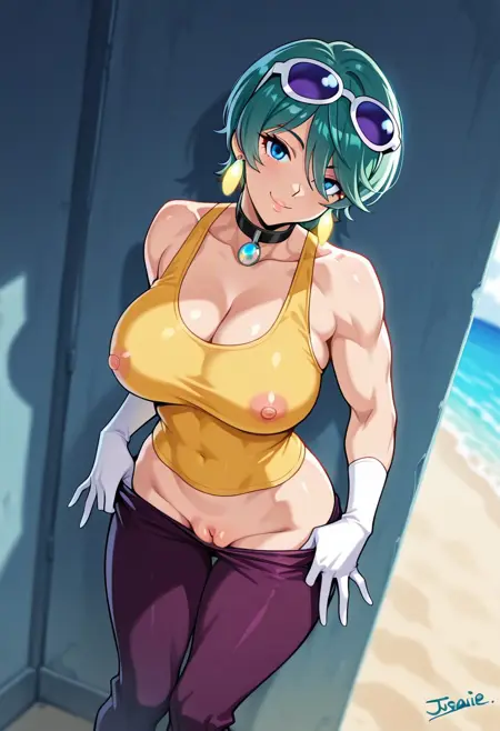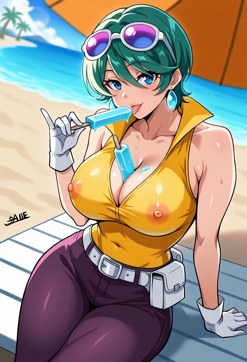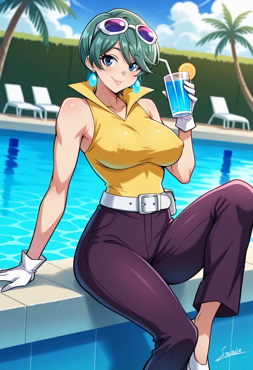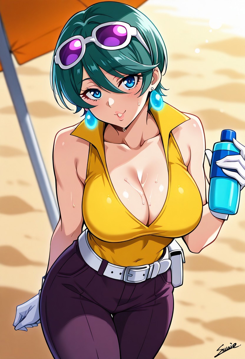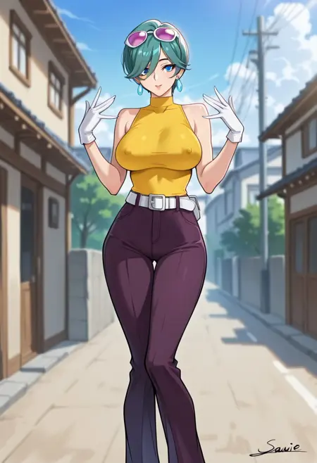 JuriSawaiE21, 1girl, solo, green hair, short hair, bangs, hair over one eye, blue eyes, lips, earrings, eyewear on head, collar, large breast, yellow shirt, white belt, dark purple pants, wide hips, shoes, long white gloves, sleeveless,