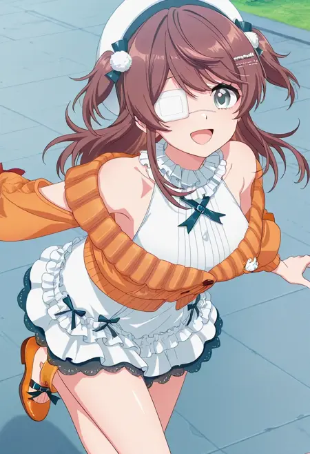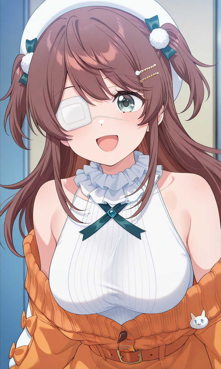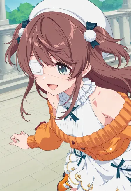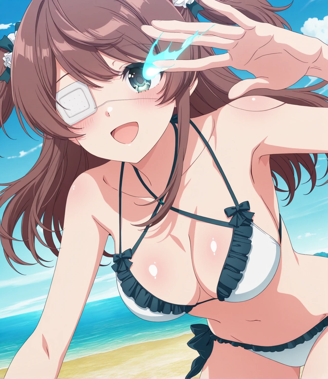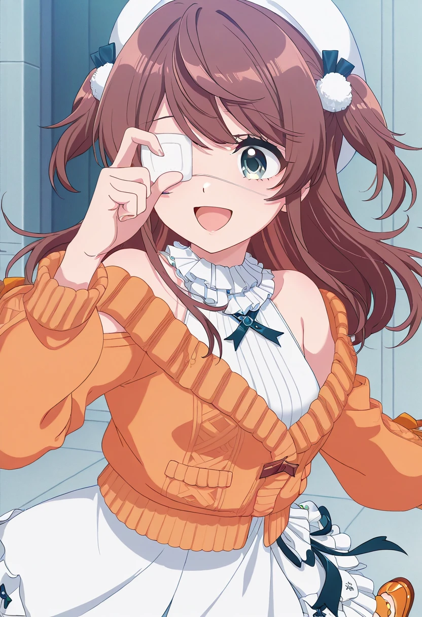 (anime coloring,anime screencap,official art:1.2),shinomiya fuyumi,large breasts, breasts,eye pacth on right eye,green eyes,brown hair,two side up