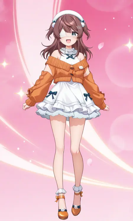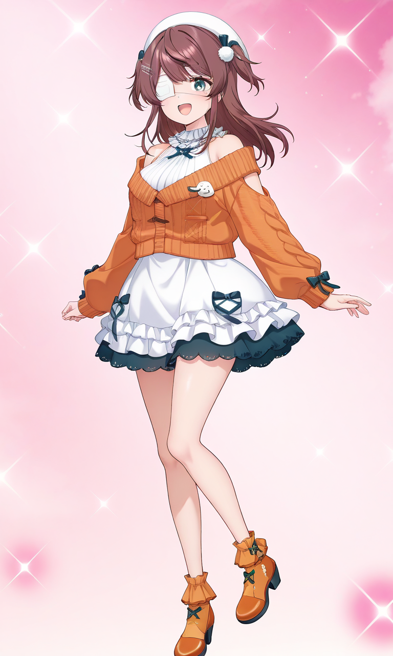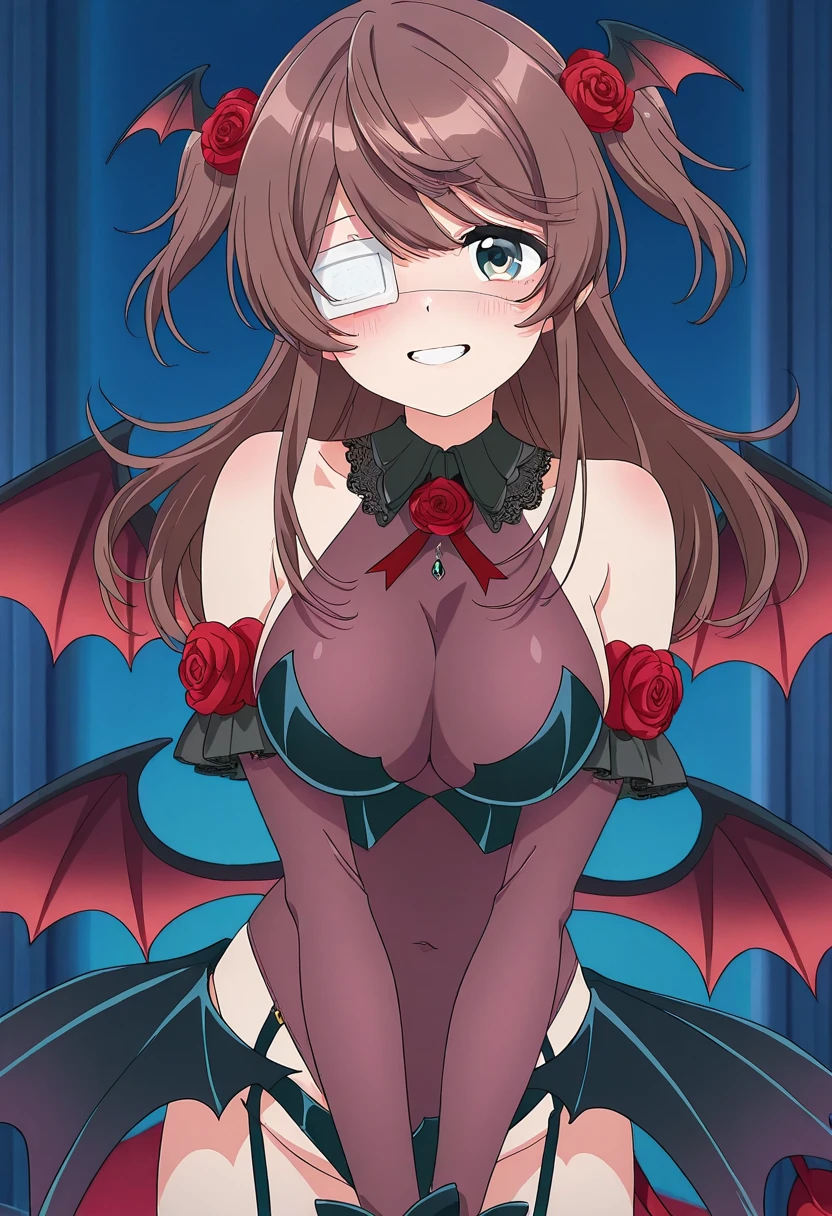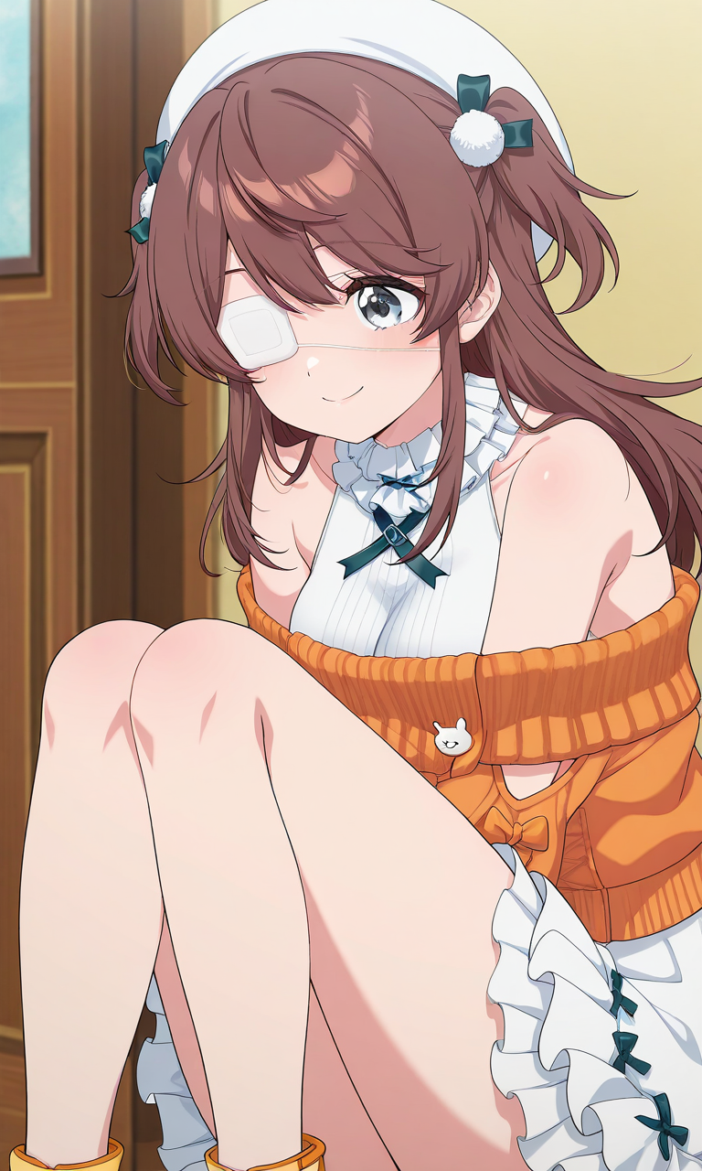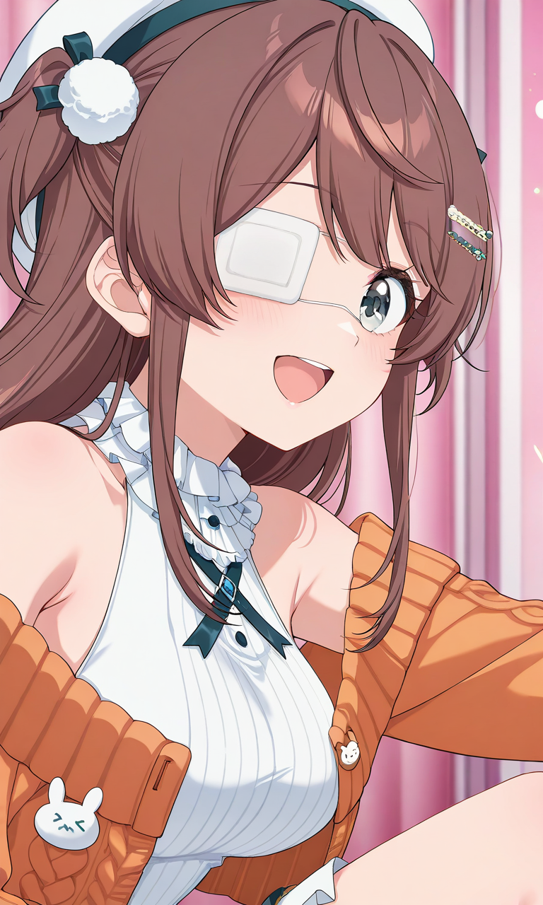 (anime coloring,anime screencap,official art:1.2),shinomiya fuyumi,large breasts, breasts,eye pacth on right eye,green eyes,brown hair,two side up