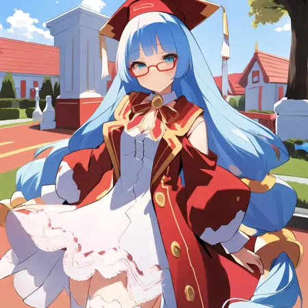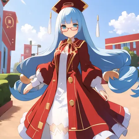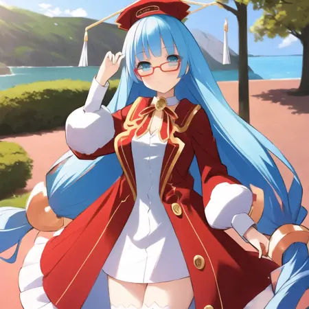 例:フルプロンプト: solo, 1girl, Mina, very long hair, twintails, low-tied long hair, blue hair, blue eyes, red-framed eyewear, cleavage, ribbon, dress, long sleeves, red headwear, white thighhighs, coat, red footwear, shoes