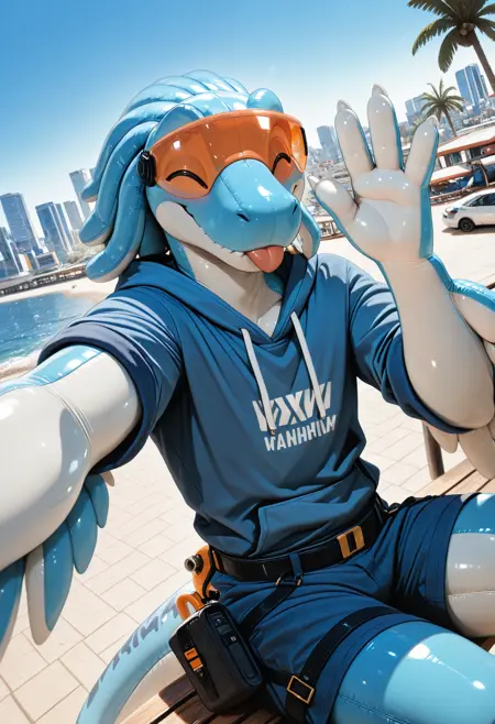 📝 Zephyr (Балуня) — живой надувной велоцираптор с глянцевой голубой поверхностью и стильными дредами. Он носит спортивную экипировку и визор, сочетая динамичность и футуристический стиль. Уверенный, энергичный и харизматичный, он всегда готов к новым приключениям в городских джунглях 🚀。