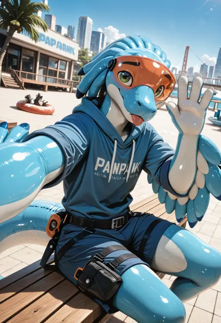 📝 Zephyr (Балуня) — живой надувной велоцираптор с глянцевой голубой поверхностью и стильными дредами. Он носит спортивную экипировку и визор, сочетая динамичность и футуристический стиль. Уверенный, энергичный и харизматичный, он всегда готов к новым приключениям в городских джунглях 🚀.
