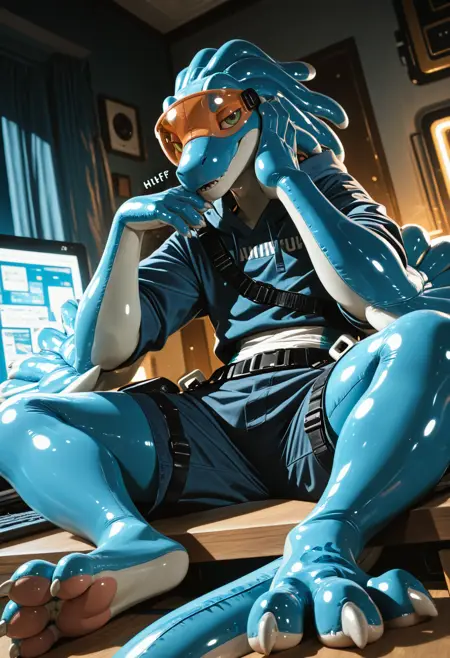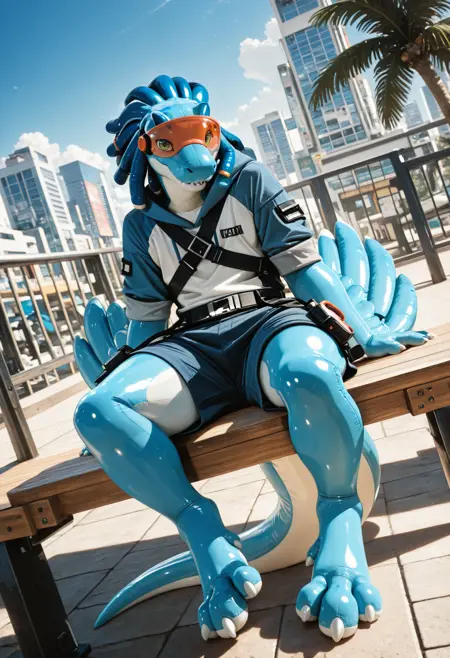 z3phyr, anthro, adult, male, bara, male focus, furry male, male, tail, scalie, green eyes, orange goggles, living inflatable, winged arms, furry, inflatable, reptile, lizard tail, colored skin, blue hair