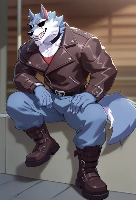 Freddy, wolf boy, scar, earrings, furry, bara,muscular male,blue fur,multicolored fur,white fur,yellow eyes,sharp teeth