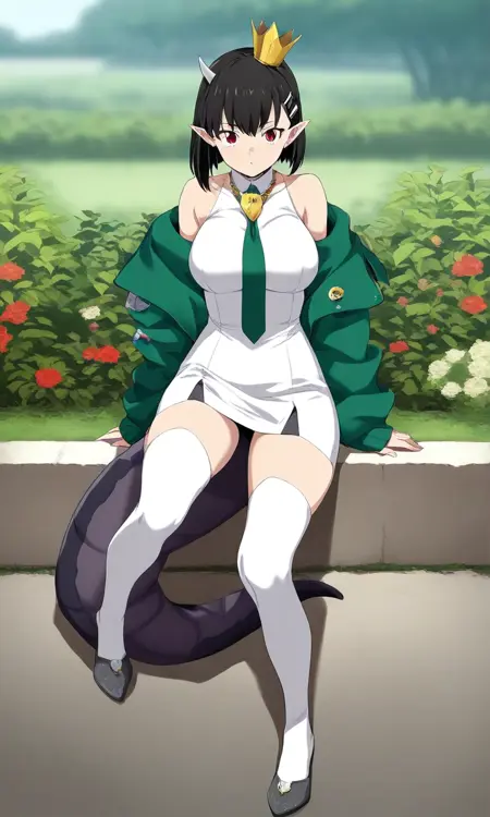 biscione, short hair, black hair, red eyes, horns, pointy ears, small crown, sleeveless white dress, green bowtie, golden necklace, green sweater, bare shoulders, snake tail, very large breasts, curvy, white thigh highs