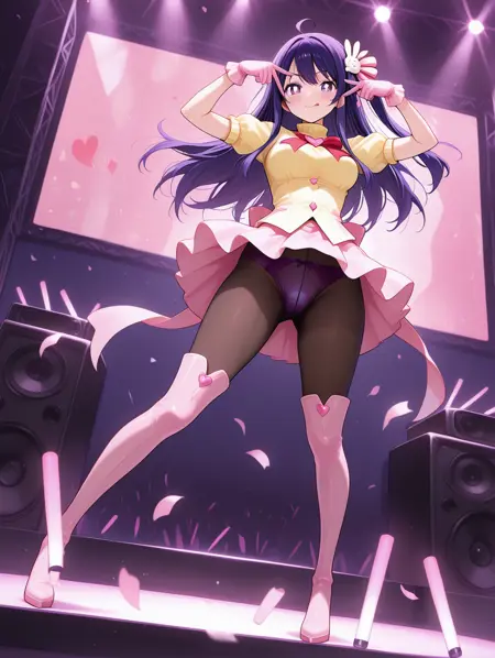 (※若生成图像视角固定,可能因服装相关标签过多导致token消耗过大,✍️使用NLP Prompt GPT输入“转换为Danbooru标签”,将提示词转换为标签并减少10~20个token。若仍固定,可适度牺牲部分服装标签的再现性,精简至pantyliner, pantyhose, panties under pantyhose, purple panties等核心标签。)