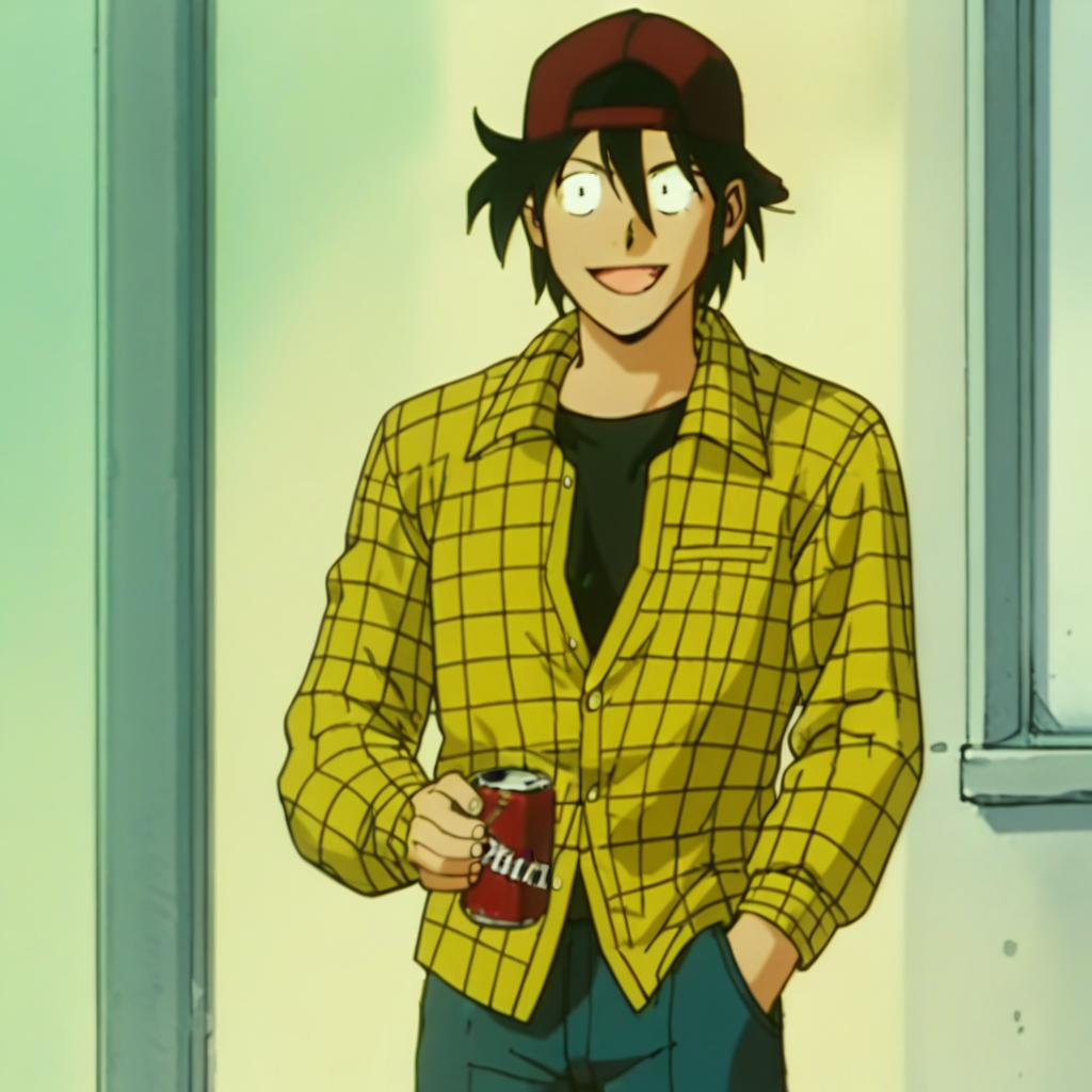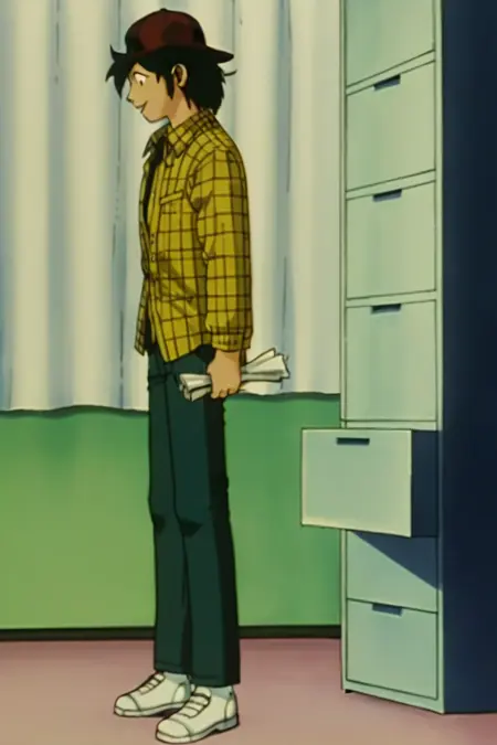 服装1:男性,黑发,黑眼,红色棒球帽,倒戴帽子,格子长袖衬衫,黑色T恤,裤子,白色运动鞋