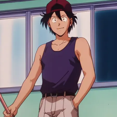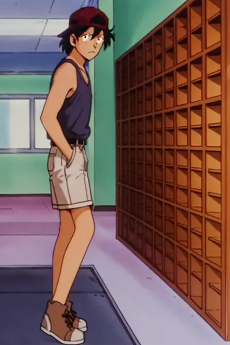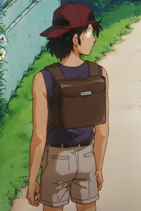 服装2:男性,黑发,黑眼,红色棒球帽,倒戴帽子,背心,腰带,短裤,棕色运动鞋,背包