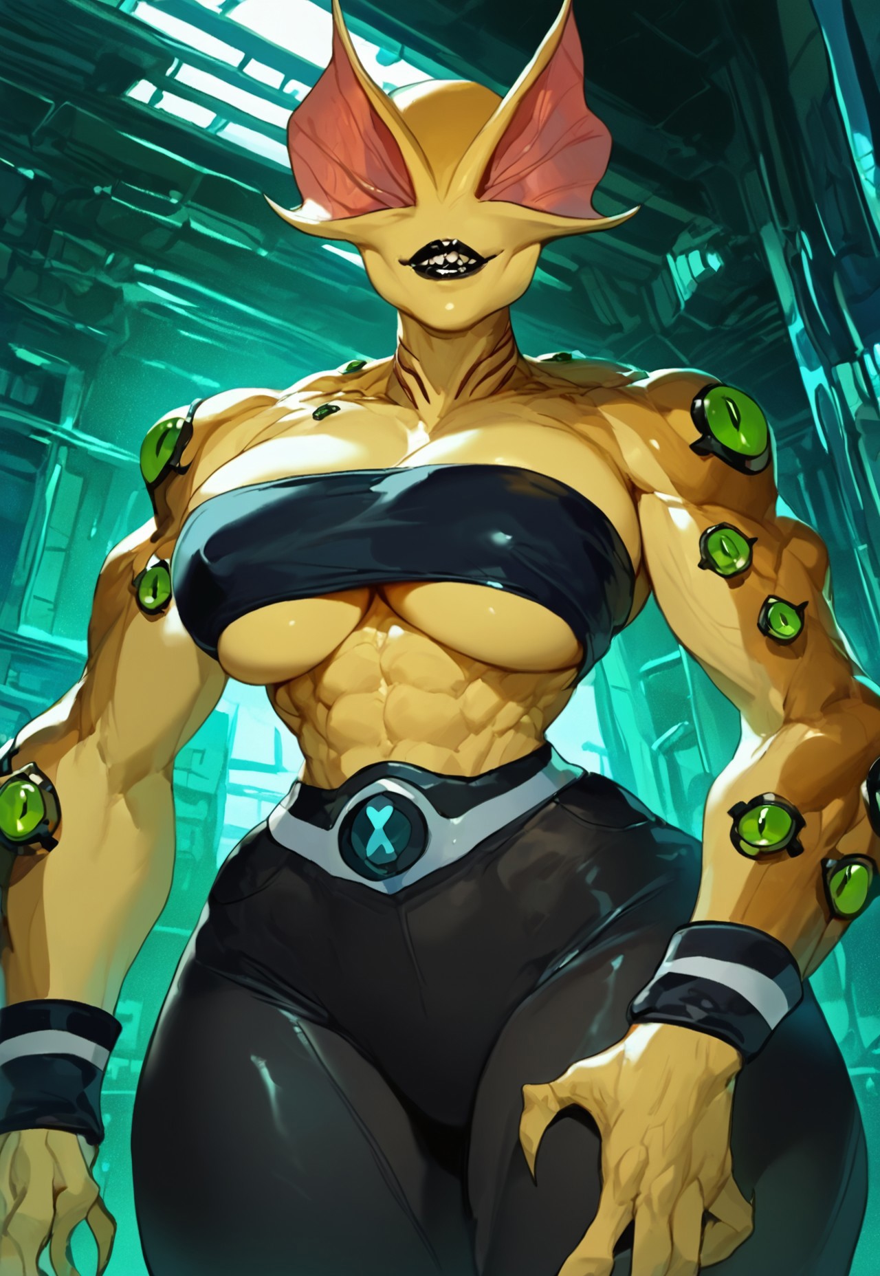 | 训练词汇 | alien girl, monster girl, two-tone skin, yellow skin, noseless, gills, multiple eyes on the body, slit pupils, fins on the face, no facial eyes, abs, muscular girl, muscular thighs, thick thighs, thin waist, abs, wide hips, thighhighs, strapless, collant, belt, jewel on belt, pink X on belt, big breasts, freckles已复制! (green eyes, pink eyes, yellow eyes)已复制! nipple eyes, eyes on breasts已复制! |