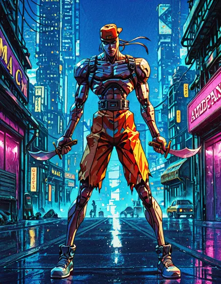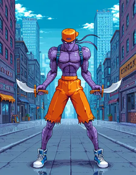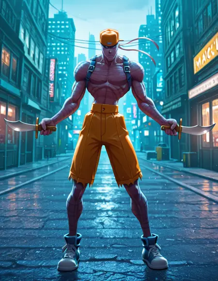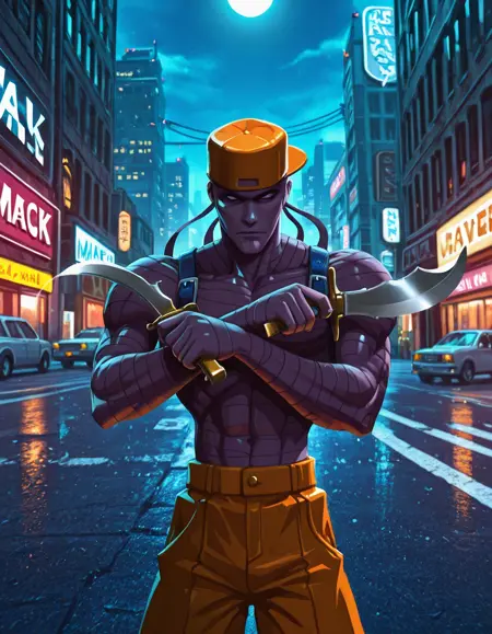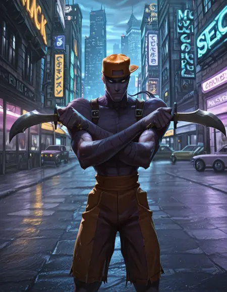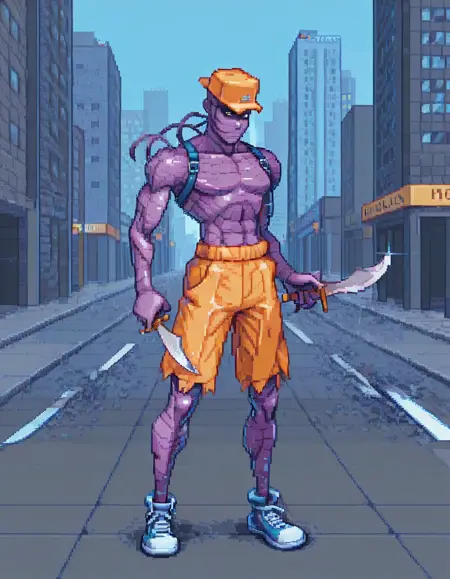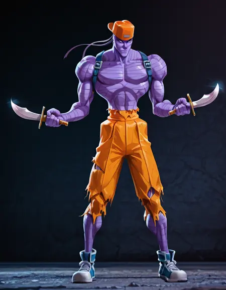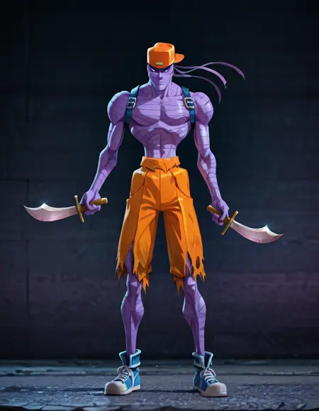 1boy, solo, male focus, dual wielding, holding, weapon, sneakers, knife, shoes, colored skin, torn clothes, topless male, orange headwear, standing, hat, purple skin, mack,
