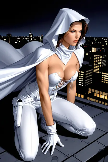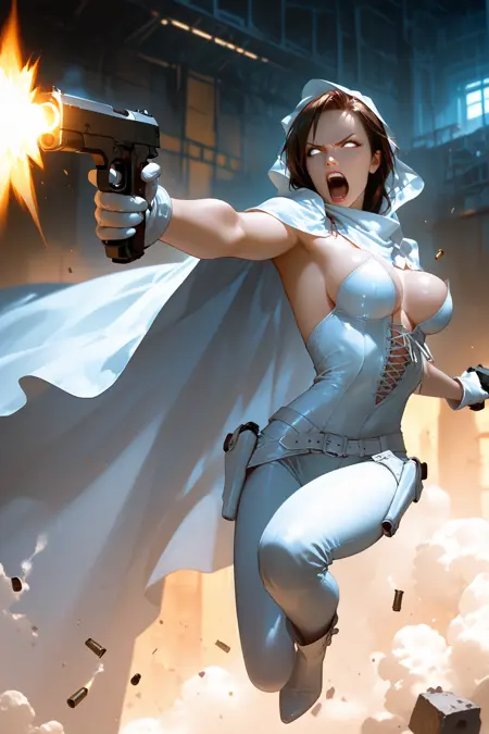 트리거 "마스크 착용": ghst, 후드, 망토, 입에 덮인 스카프, 마스크, 흰 눈동자, 눈동자 없음, 십자 끈 옷, 가슴 노출, 장갑, 벨트, 바지, 총기 파우치, 부츠
