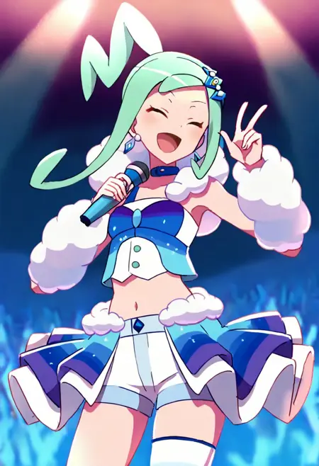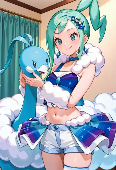 For her outfit/appearance: Lisia_Outfit, Aqua hair, aqua eyes, overskirt, shorts, single thighhigh, midriff, navel, hair ornament, choker, arm warmers, blue footwear, ankle cuffs, blue footwear,