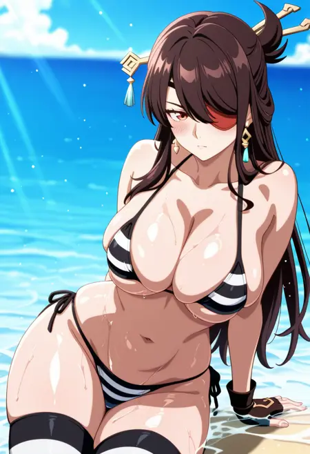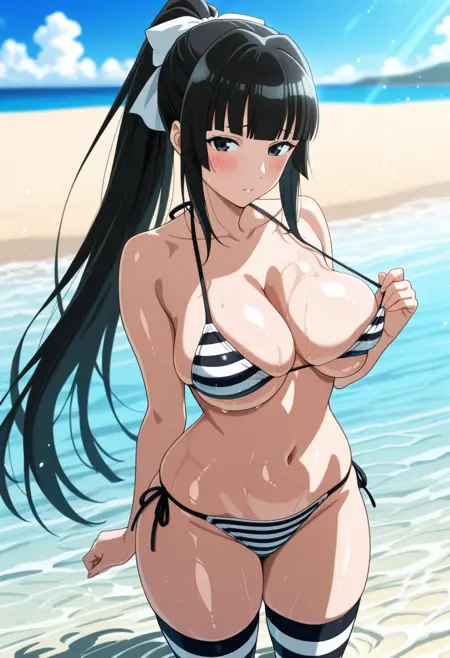 必ずトリガー語句 `babu_style, mature female, shiny skin, animification, deep skin, skindentation, blush, navel` を使用してください。