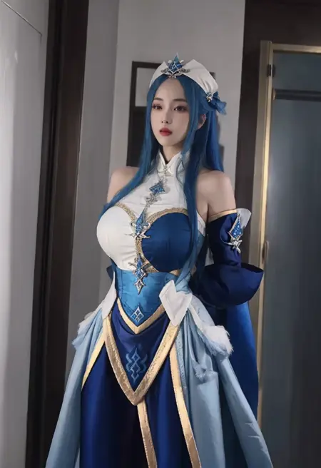 긍정적 프롬프트 추천: 1girl, solo, pale skin, perfect body, glossy skin, wzrywzjkiller, blue hair, gloves, standing, dress, long hair, bare shoulders, azura (fire emblem), (close-up photo), (upper_body), sense of reality,