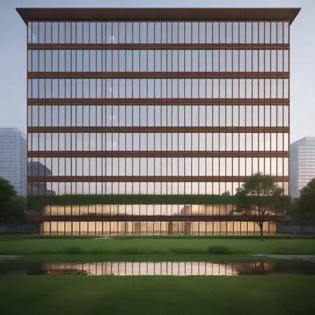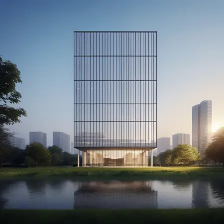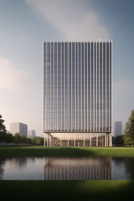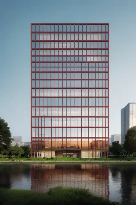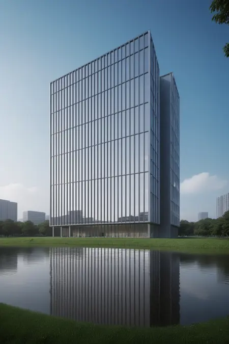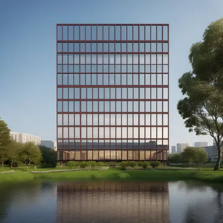 (masterpiece), best quality, 8K, no humans, shifanqu, demonstration area, outdoors, building, scenery, tree, sky, reflection, grass, window,