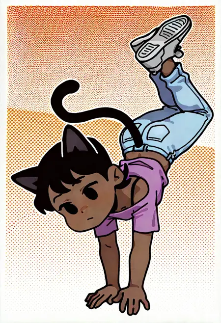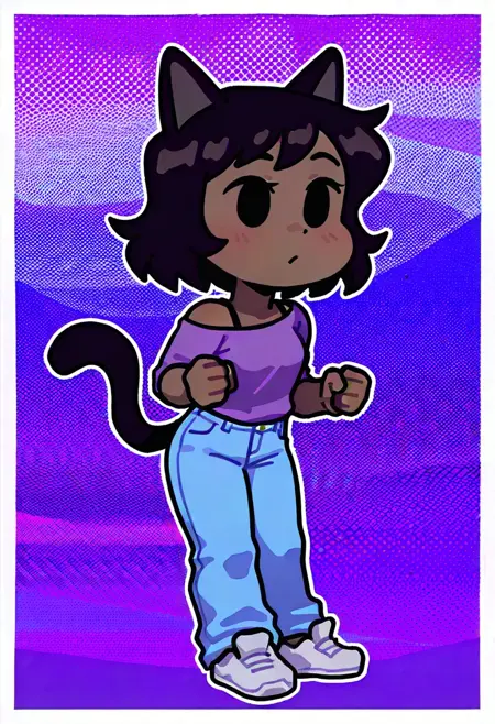| Trained Words | MomiFNF, 1girl, dark skinned female, dark brown hair, purple shirt with black straps, blue jeans, silver shoes, light pink headband, black eyes, chibi, short, no sclera,Copied! MomiFNF, 1girl, dark skinned female, dark brown hair, purple shirt with black straps, blue jeans, silver shoes, dark brown cat ears, dark brown cat tail, black eyes, chibi, short, no scleraCopied! |