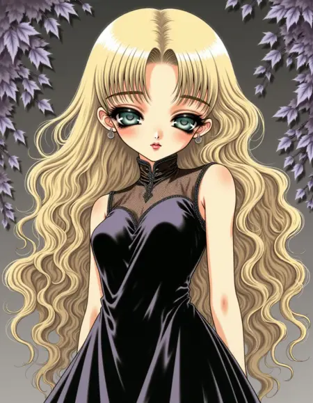 该风格为复古漫画,使用粉彩和彩色铅笔手绘,边缘柔和,细节丰富。线条柔和,带有羽毛般的笔触。--- {您的提示} --- 闪烁发光,柔和色调,光泽双眼,空灵,手绘,复古,哥特粉彩,眼睛呈方形,阴森,娃娃般,90年代柔软漫画风格。
