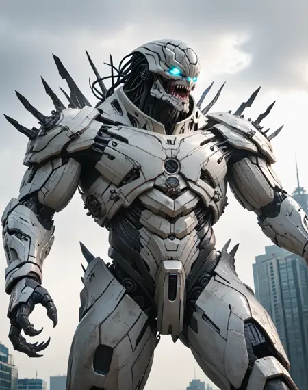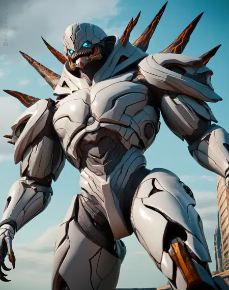 Adding other prompts like ( male focus, kaiju, monster, sharp white teeth, multiple rows of glowing blue eyes, glossy white metal body, bioboosted armor, black kaiju skin with glowing blue veins, ) helps the look show up better. Otherwise by default it tends to make a typical looking mech similar to the evil one that briefly showed up in the movie before the event with the kaiju drones came about.