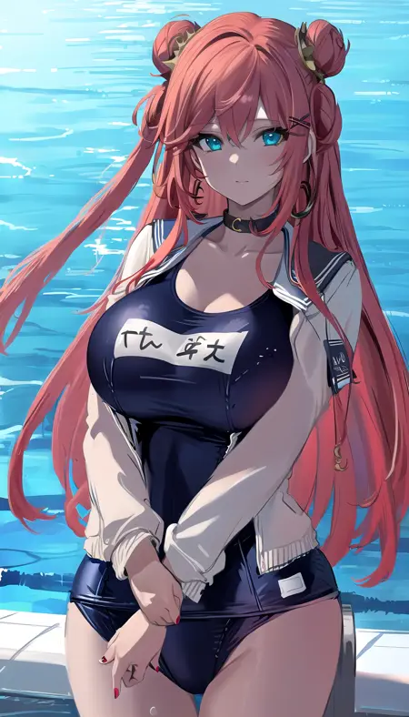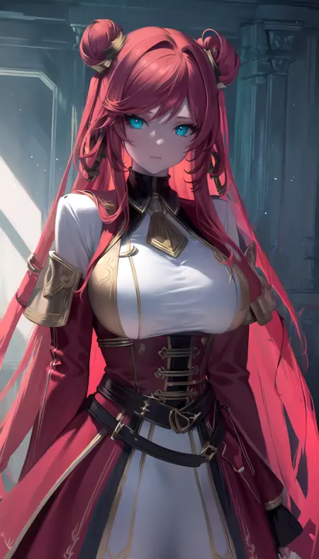 hair rings,red hair,double bun,aqua eyes,very long hair,1girl,