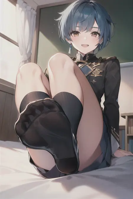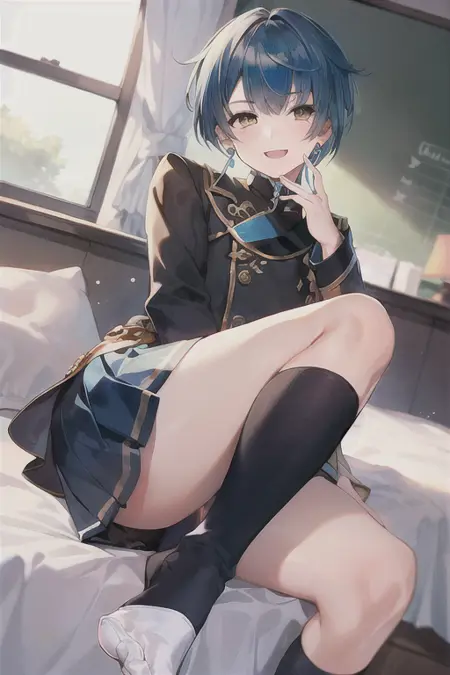 lora:xingqiu-000018:\*,((masterpiece,best quality)), dynamic angle, (beautiful delicate face:1.1),1boy,solo, light blue hair, fluffy medium-short hair, bangs,earrings, brown eyes, blue and black Military highschool dress,((school uniform))