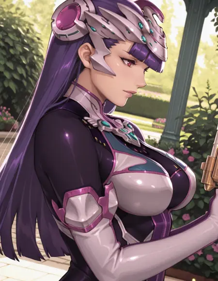 프롬프트 예시: 1girl, persephone, ((solo)), wa5, bodysuit, long hair, purple hair, red eyes, half body, from below, headdress, android, helmet, thick body, Dutch angle, gun <lora:Wild_Arms_5_Persephone:1>,
