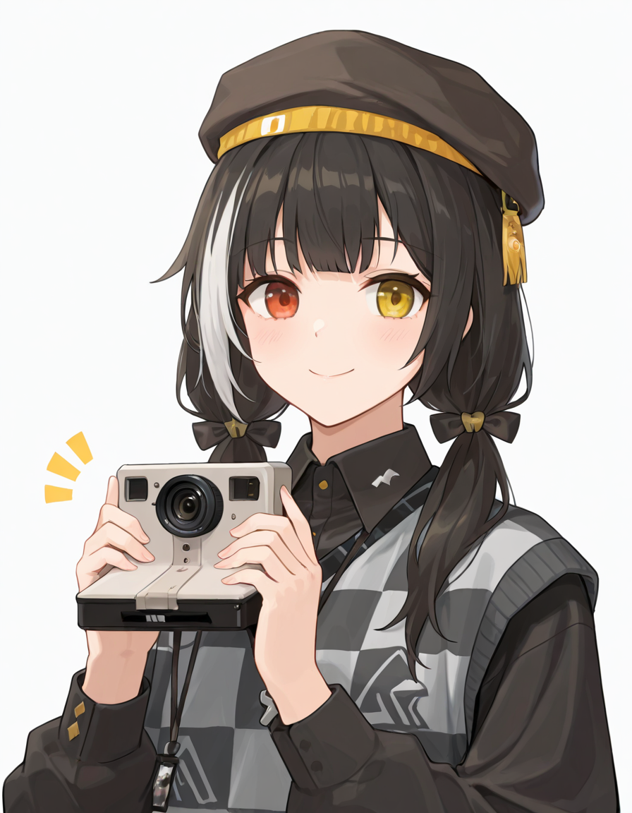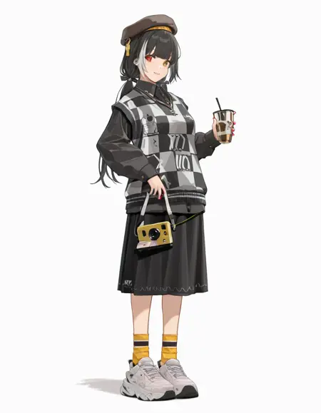 MonochromeJungleBird, MJB_checkered_sweater_vest, MJB_necklace, MJB_collared_shirt, MJB_sneakers, MJB_skirt, MJB_beret, MJB_socks, MJB_bag, MJB_camera,hair bow