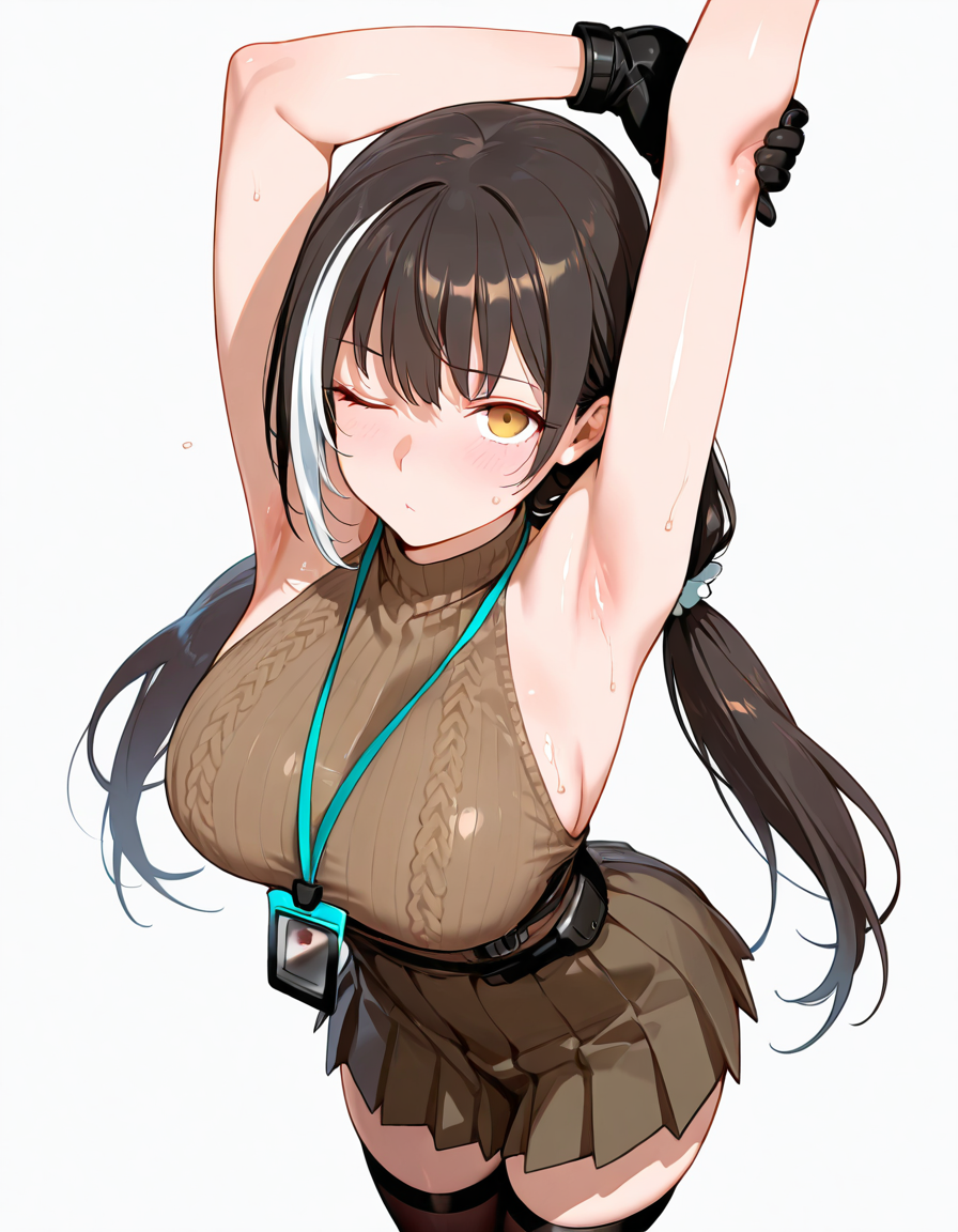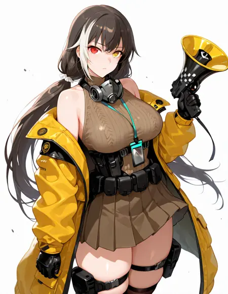 RO635mod3, mod3_belt_pouch, mod3_knee_pads, mod3_thigh_holster, mod3_thighs_straps,mask around neck, mod3_sleeveless_sweater, mod3_skirt, mod3_lanyard, mod3_id_card, mod3_jacket, off-shoulders, mod3_over-kneehighs, mod3_gloves