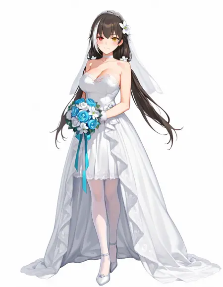 heterochromia, red eye, yellow eye, black hair, low twintails, streaked hair, white hair