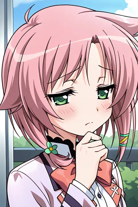 kawamura yu,green eyes,pink hair,short hair with long locks,hair ribbon,hair flower,
