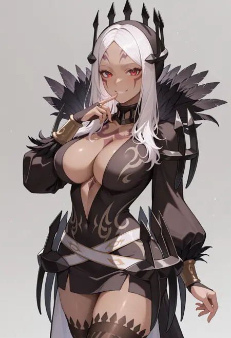 aversadf, 빨간 눈, 얼굴 무늬, 검은 피부의 여성, 흰 머리, 긴 머리, 검은 왕관, 큰 가슴, 몸무늬, 문신, 검은 드레스, 깃털 트림, 검은 깃털, 중앙 개방, 긴 소매, 웨딩 장갑, 검은 허벅지 양말, 긴 손톱, 검은 손톱