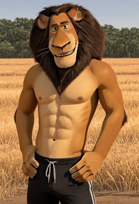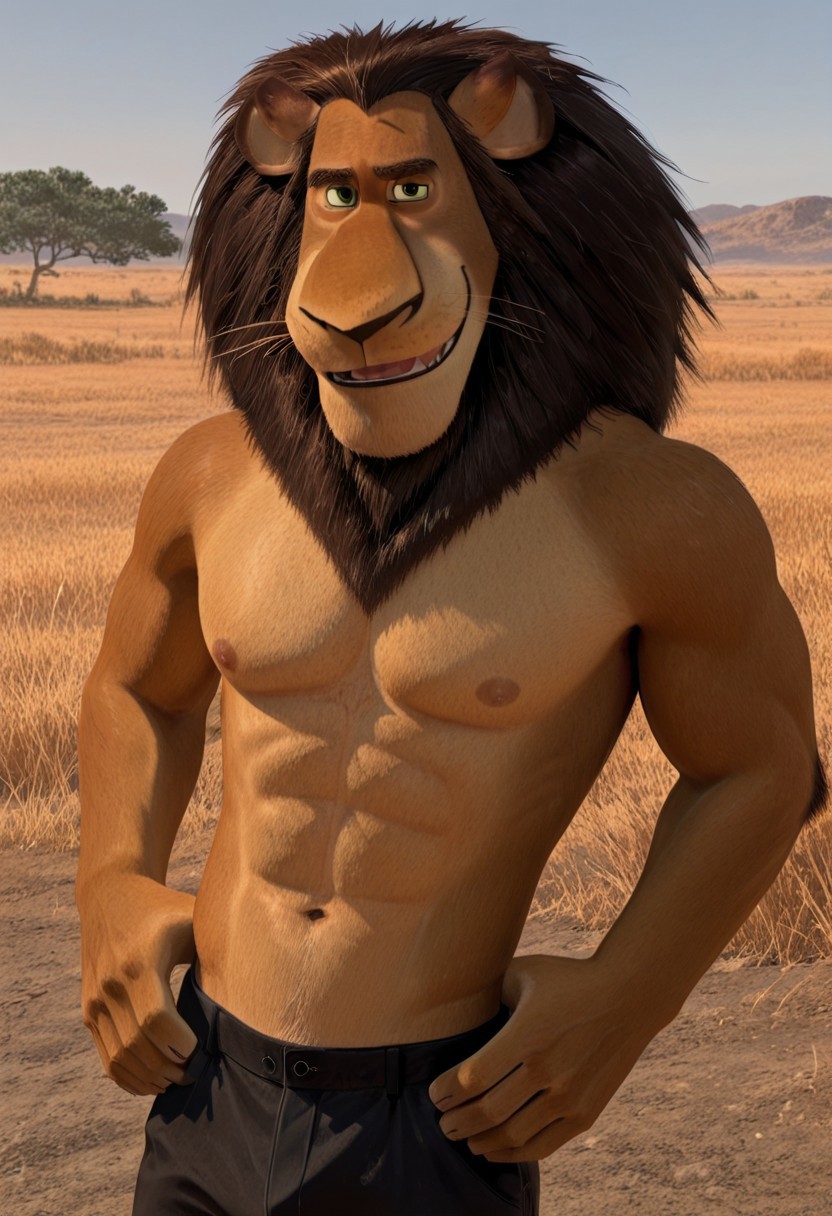 Zuba, 1boy, mature male, male, older male, athletic build, anthro, lion, animal ears, green eyes, dark tan fur, dark brown hair, dark brown mane, gray hairs