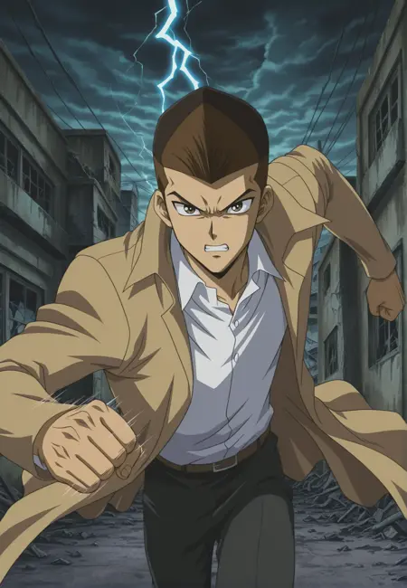 决斗王国造型:本田广人,棕色头发 黑色头发,棕色眼睛,棕色风衣,有领衬衫 白色衬衫,黑色裤子,动漫截图