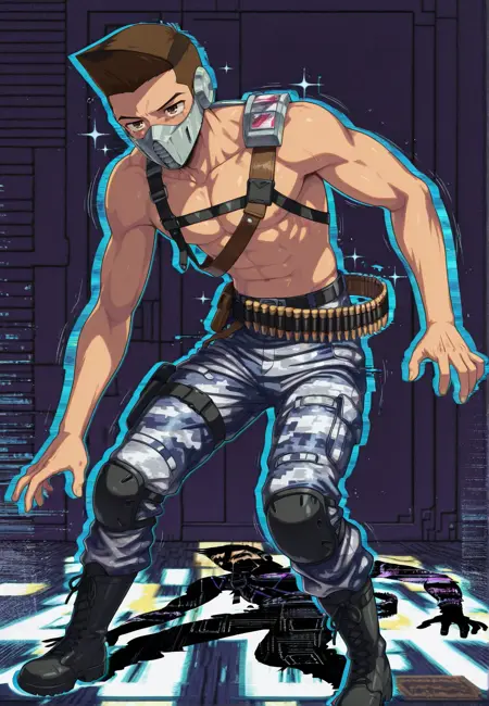 Cyber Commander Outfit-ish: hiroto_honda, cyber_commander outfit, silver mask, bandoleer, brown_eyes, brown_hair black_hair, topless_male chest_straps, blue camo pants, combat_boots, anime_screencap