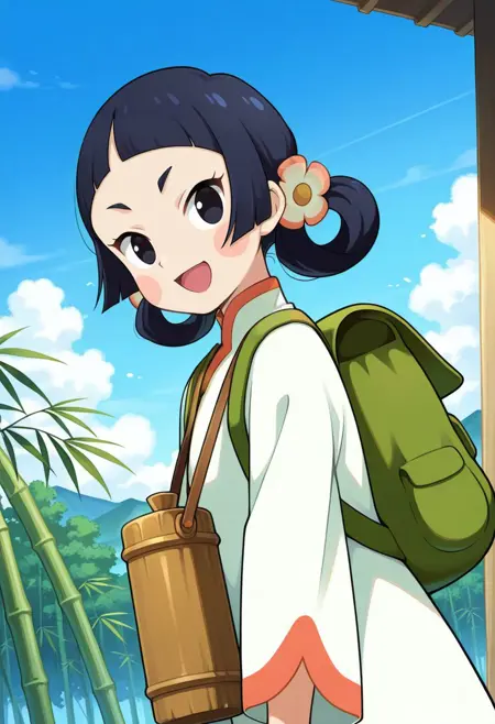 green backpack, bamboo umbrella, bamboo canteen, side bag,