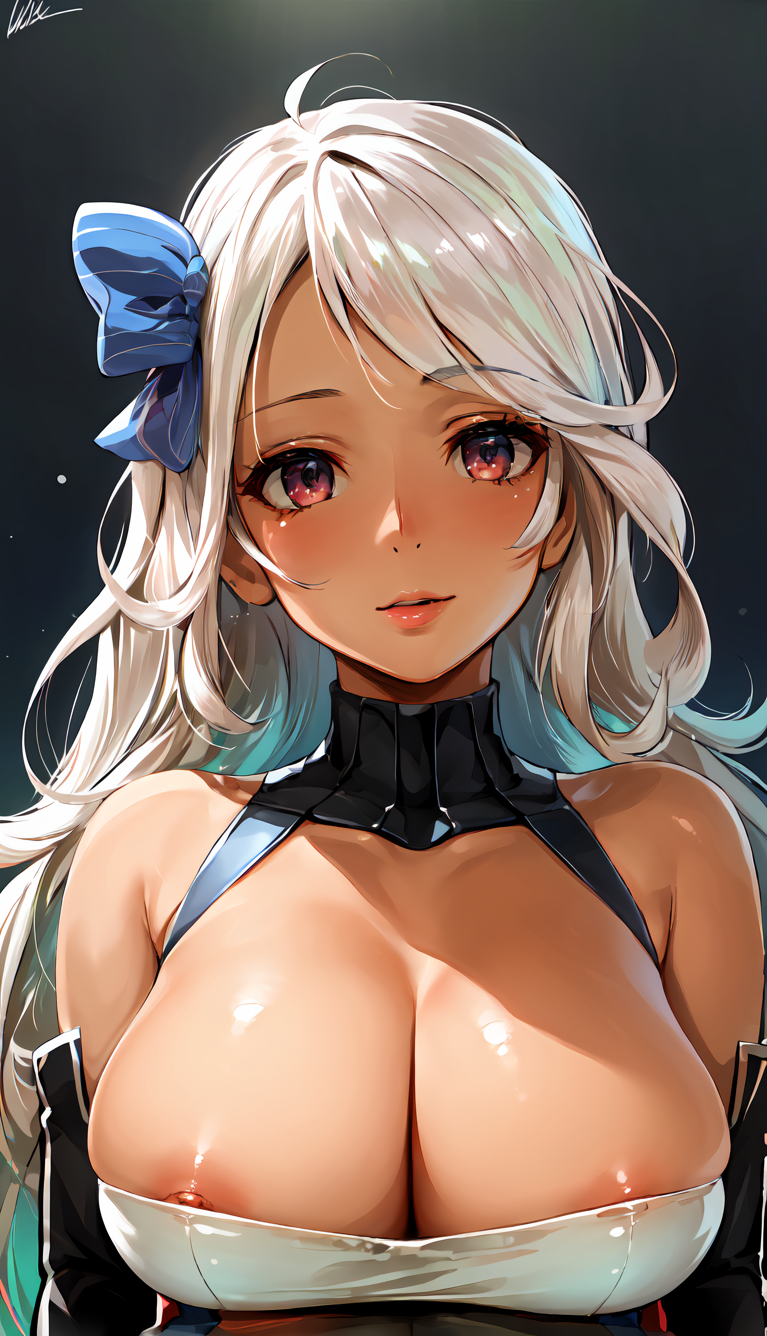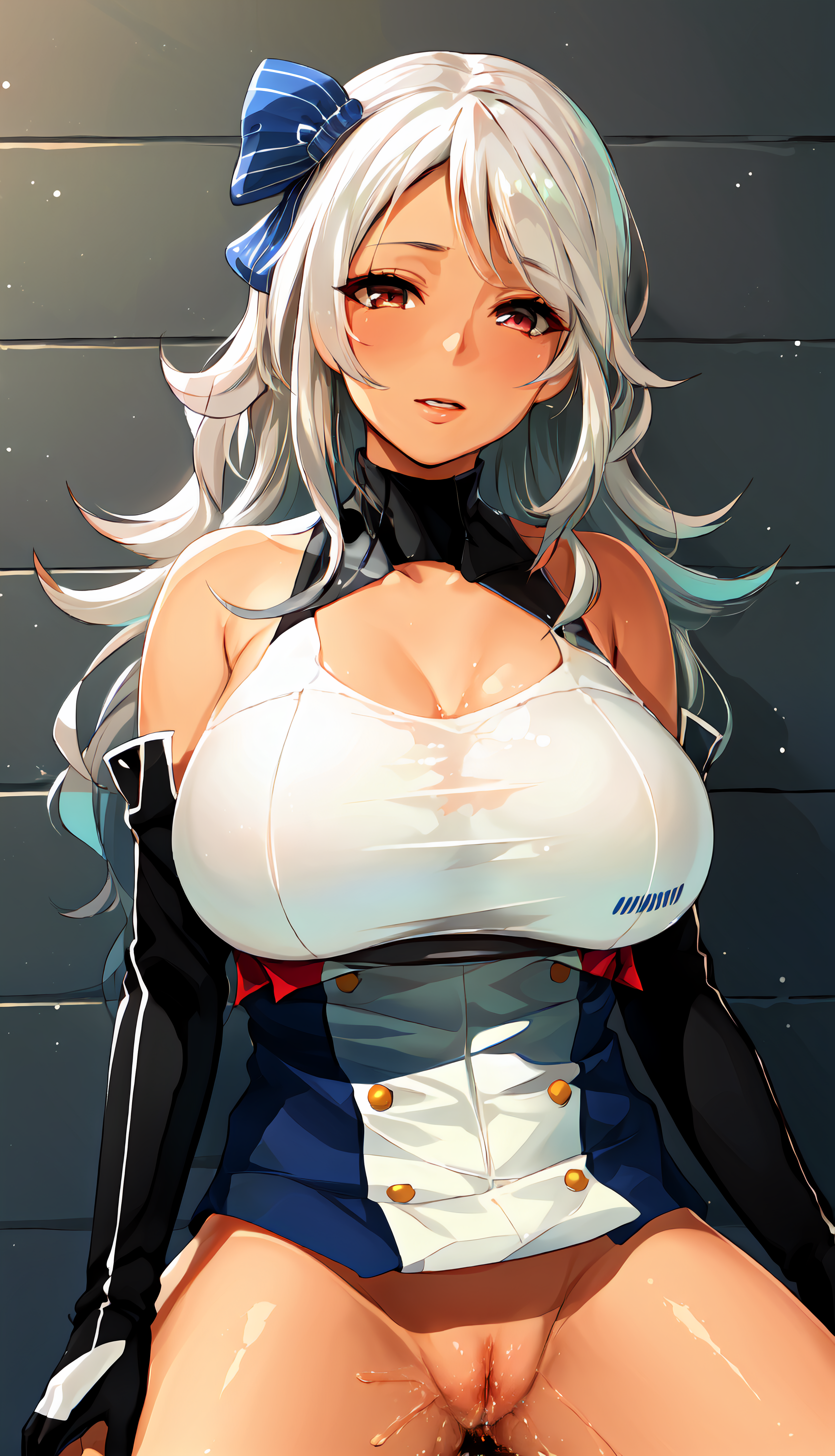 Brooklyn, 1girl, solo, looking at viewer, nude, white hair, huge breasts, nipples, hair bow, pussy;