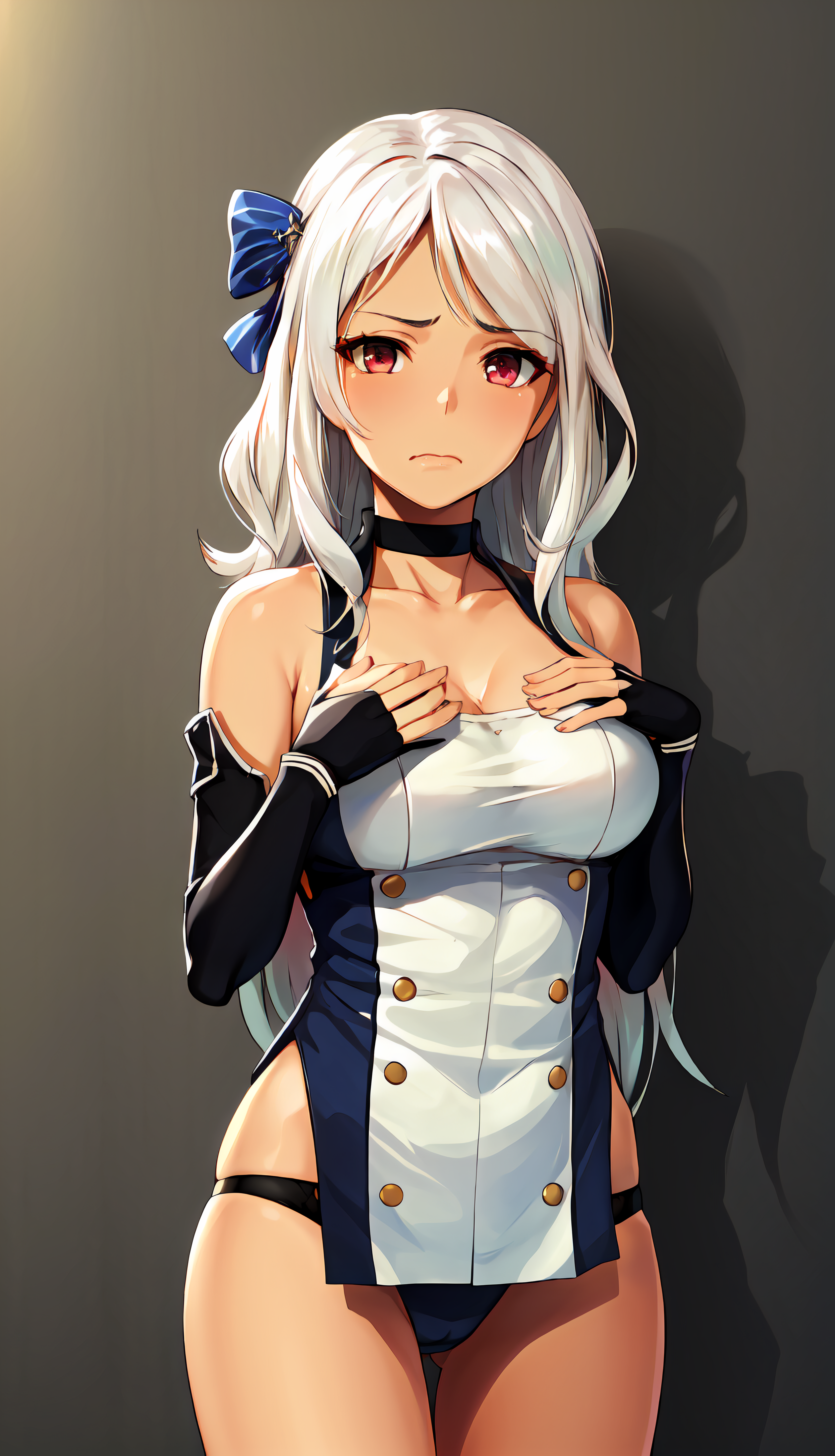 Brooklyn, 1girl, solo, looking at viewer, standing, white hair, cowboy shot, choker, frown, hand on own chest, collar, hair bow, bare shoulders, underwear;