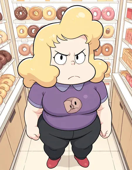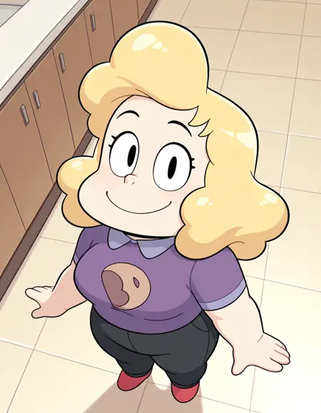 sadiemiller,金发,蓬松头发,黑眼睛,紫色衬衫,有领衬衫,甜甜圈图案,短袖,黑裤,红色鞋子